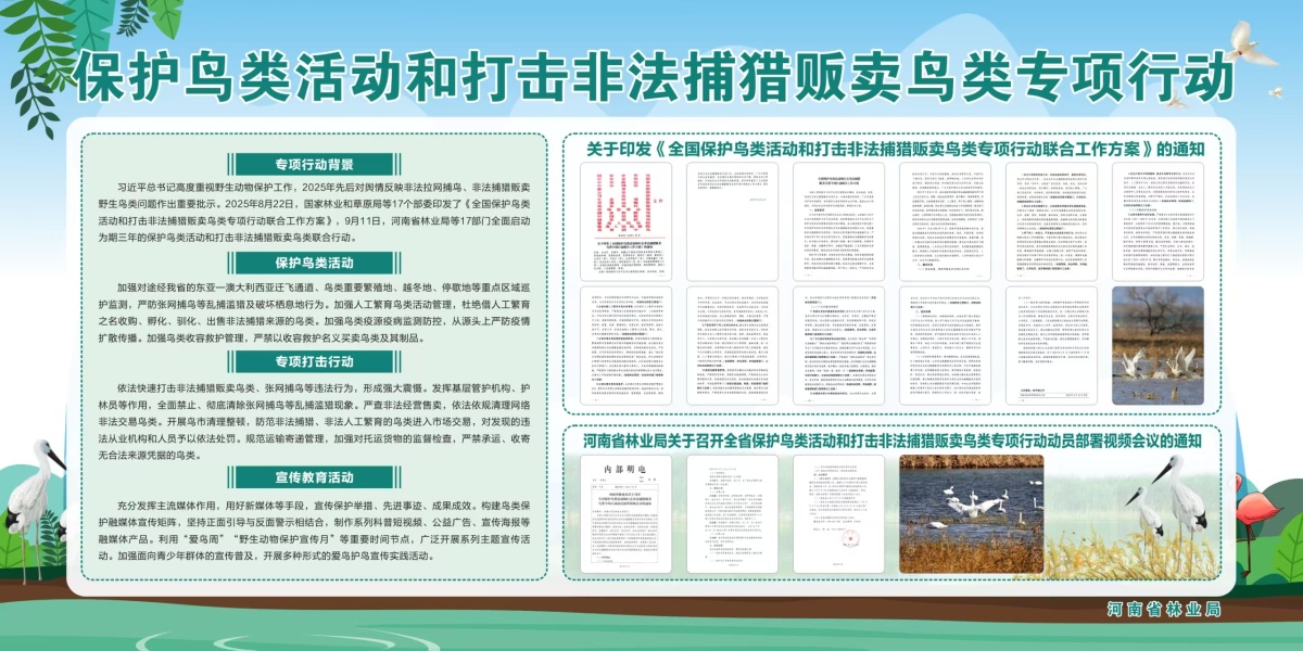 2025年9月11日,河南省林业局等17部门全面启动为期三年的保护鸟类活动和打击非法捕猎贩卖鸟类联合行动。