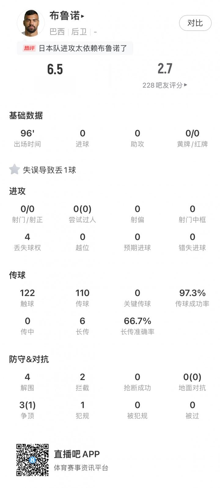 此役,巴西首发中卫布鲁诺上演灾难级别表现,先是腿软送对手单刀,此后又解围时不慎爆射自家球门打入乌龙,直接帮助日本队完成让二追三。