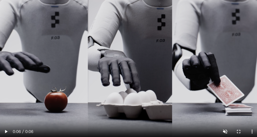 不仅如此,机械手的触觉也得到了改良。Figure03有着更加柔软灵敏的指尖,与物品的接触面积相应扩大,抓取物品变得更加稳定和灵巧。据官方测试,每个指尖传感器都能检测到低至3克的压力,其灵敏度足以感知回形针在手指上的重量。现在,不论是易碎、不规则,抑或是移动着的物体,新一代机器人都能轻松“拿捏”。