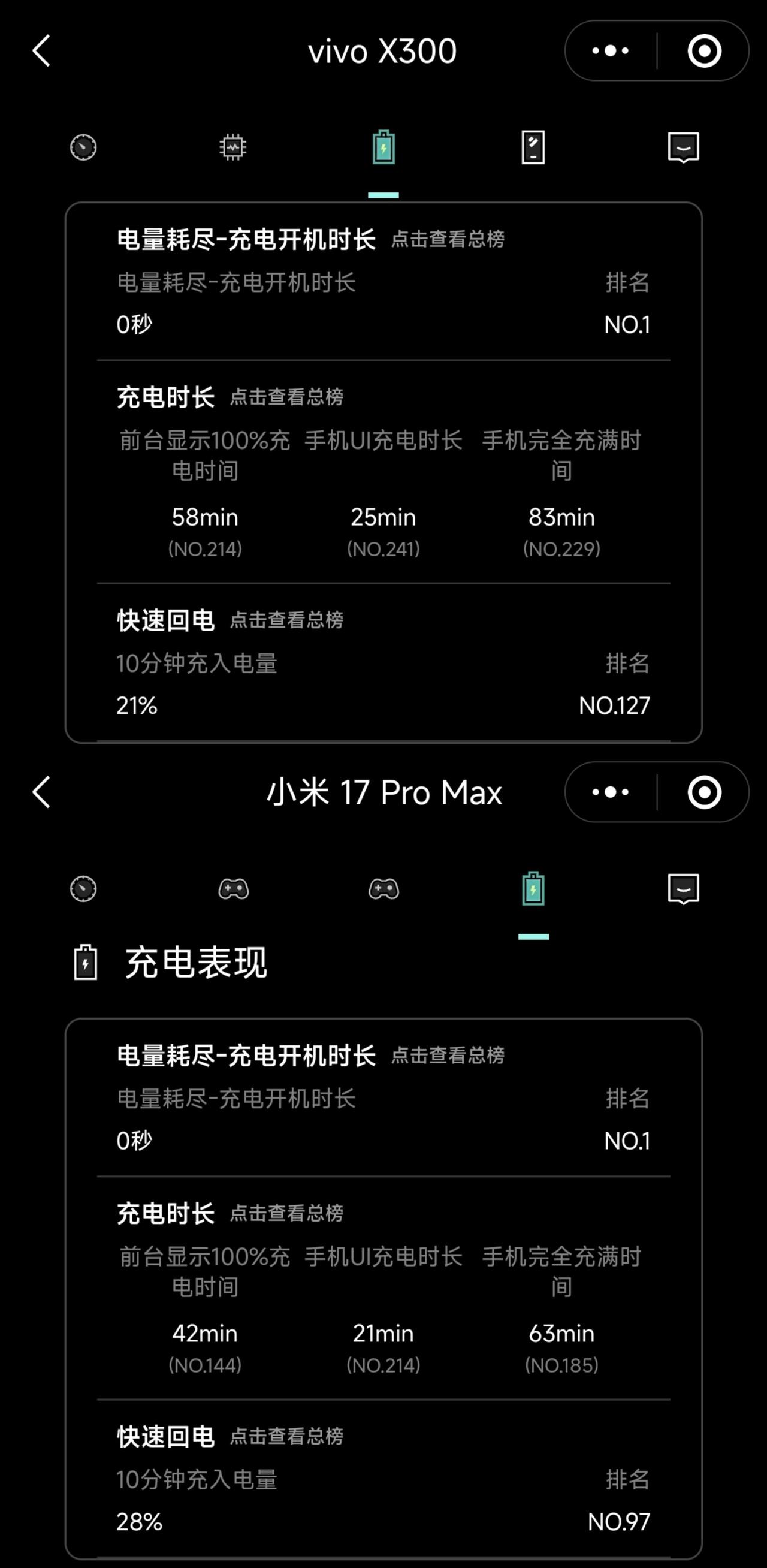 关于vivo X300系列,汇总了些网友吐槽的点,购买前可以参考一下 槽点1:金子内存,12+256到16+512直接+900,16+512相比去年涨300 槽点2:发布会说什么和7000电池续航差不多,说优化好,实际上重度使用可能就露馅,搞不好跟华为之前一样,20%电以前显示掉的慢,以后巨快 槽点3:6000mAh电池没有7500mAh充的快,如图 槽点4:网上鼓吹的人真挺多,看到不少刷吊打小米17的,就算主摄一个底大一个高像素打平手吧,电池、快充、处理器、扬声器哪个不比x300强? 你说有取舍,你就喜欢潜望长焦,拍照多,其他的你不care也就算了,非得踩友商一脚干嘛[捂脸]发布会还说旗舰标配usb3.2,这更是别人早就有的东西。怎么说呢,如果很看重影像,那X300真没毛病,但要是不重影像,其实选择还挺多的...