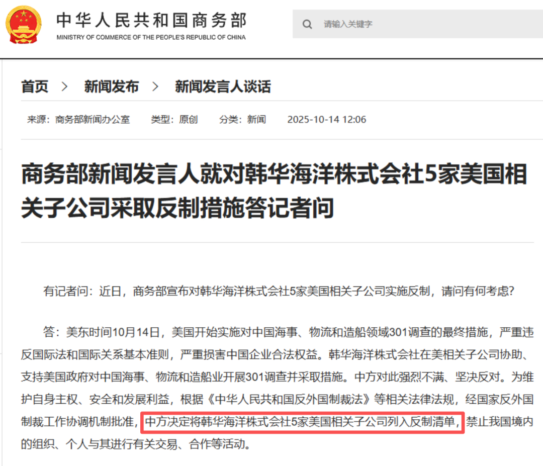 同时,将韩华海洋株式会社5家美国相关子公司列入反制清单。韩华的几个子公司将直接失去庞大的中国市场及相关合作机会,同时也无法再利用中国供应链。