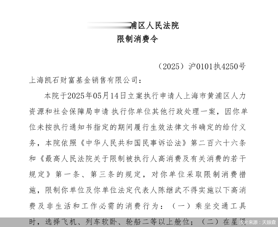 尽管具体纠纷细节未公开,但上海市黄浦区人民法院于6月6日发布的限制消费令显示,其于2025年5月14日立案执行申请人上海市黄浦区人力资源和社会保障局(以下简称“黄浦人社局”)申请执行凯石财富其他行政处理一案,因凯石财富未在指定期间履行生效法律文书确定的给付义务,故对凯石财富采取限制消费措施,限制凯石财富及其法定代表人陈继武不得实施高消费及非生活和工作必需的消费行为。