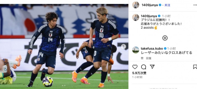 久保建英、三笘薰、长友佑都为这条社媒点赞,久保建英还评论道:“你的传中如激光般精准。”