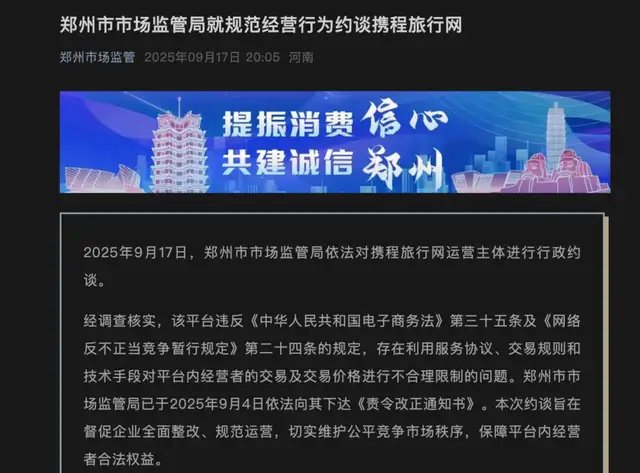 而就在国庆节前,郑州市场监管局刚刚点名携程,称它“利用服务协议、交易规则和技术手段,对平台内经营者交易及价格进行不合理限制”,要求马上整改。