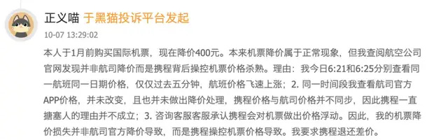 这个国庆假期,有不少消费者投诉携程。有人表示,自己查看同一航班同一日期价格,仅仅过去五分钟,航班价格飞速上涨。同一时间段查看航司官方APP价格,并未改变,且也并未做出降价处理,携程价格与航司价格并不同步。