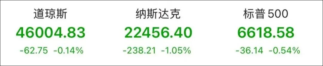10月14日周二,美股三大指数集体低开。截至北京时间23时20分,道指跌0.14%,报46004.83点;纳斯达克指数跌1.05%,报22456.40点;标普500指数跌0.54%,报6618.58点。