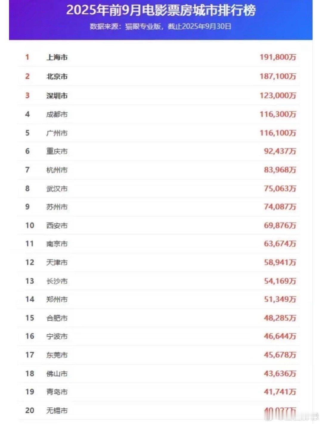 今年城市电影票房贡献榜,上海和北京真是遥遥领先