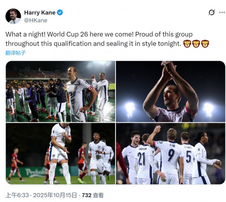 凯恩社媒晒出谢场的照片,并配文:“多么美妙的一夜!2026年世界杯我们来了!为球队在世预赛中的表现感到骄傲,今晚更是以精彩的胜利锁定席位!”