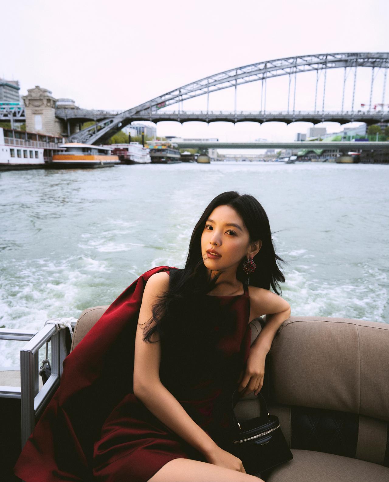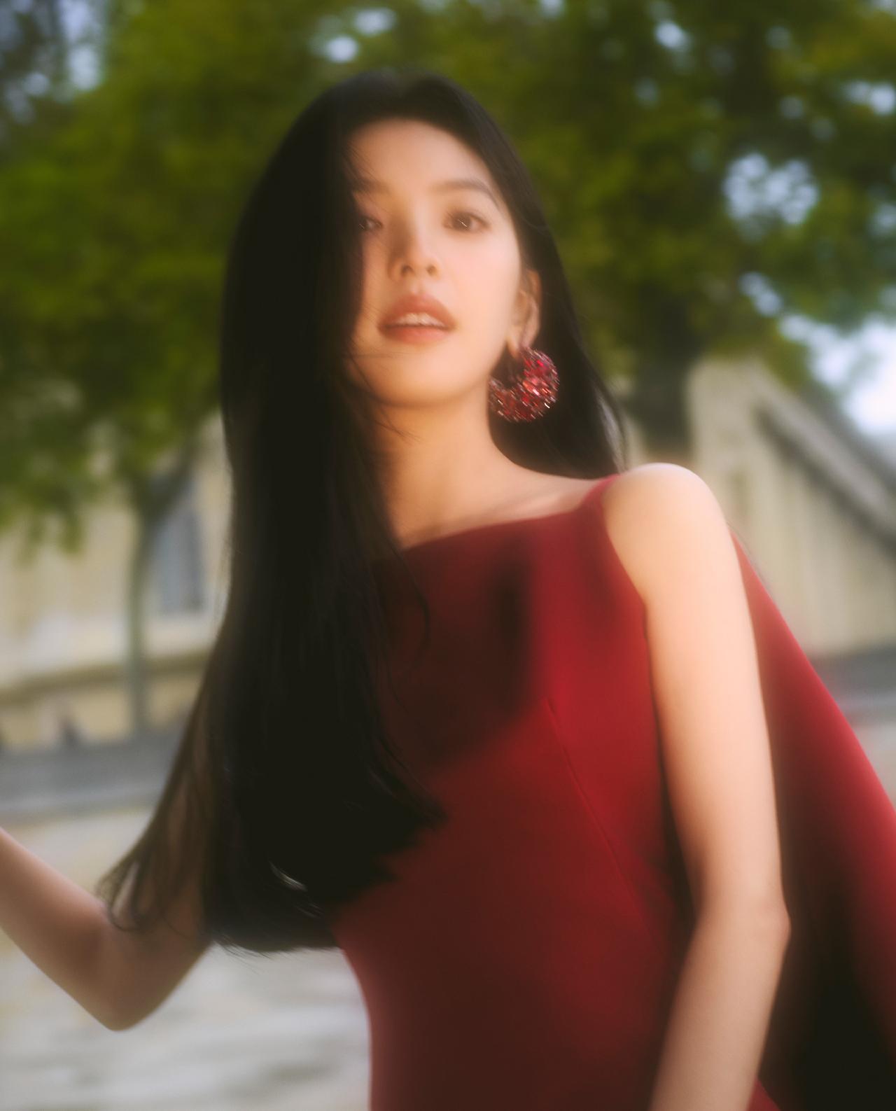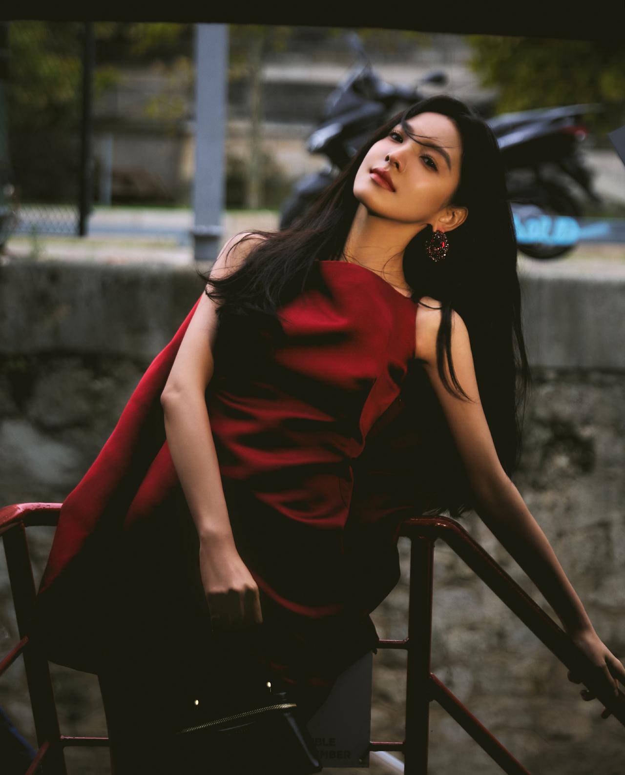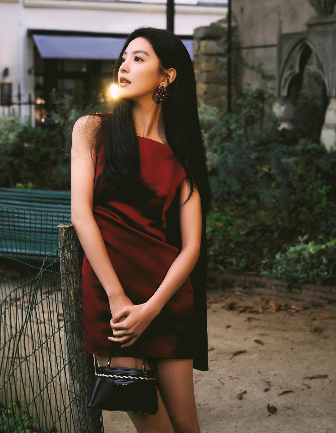 酒红色与她的冷白肤色相互映衬,衬得肌肤白皙透亮,裙身线条贴合身形,勾勒出灵动的少