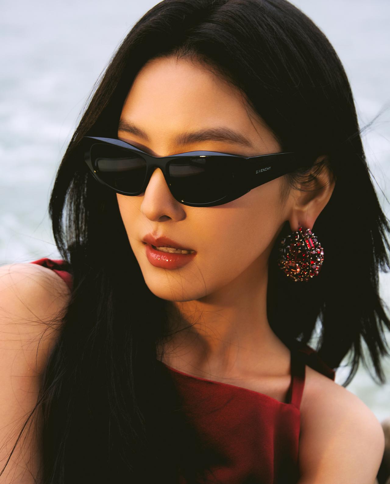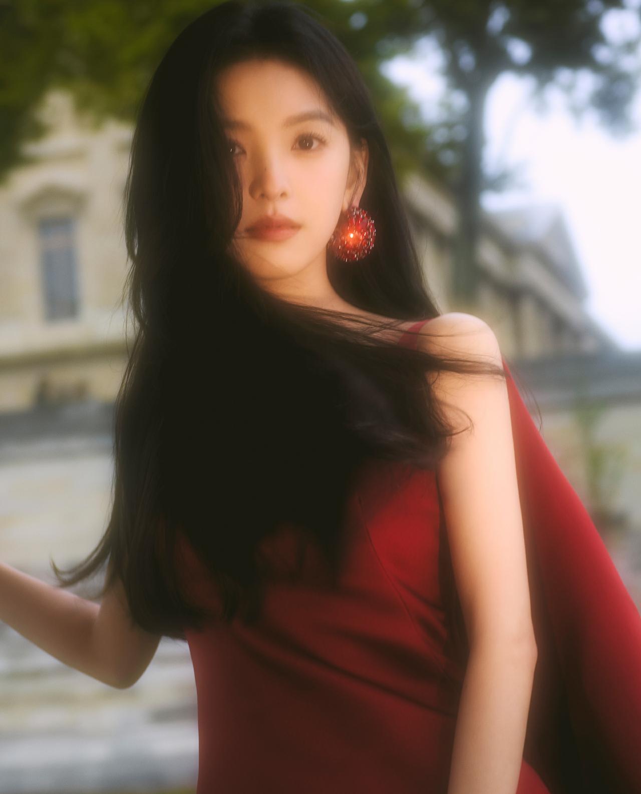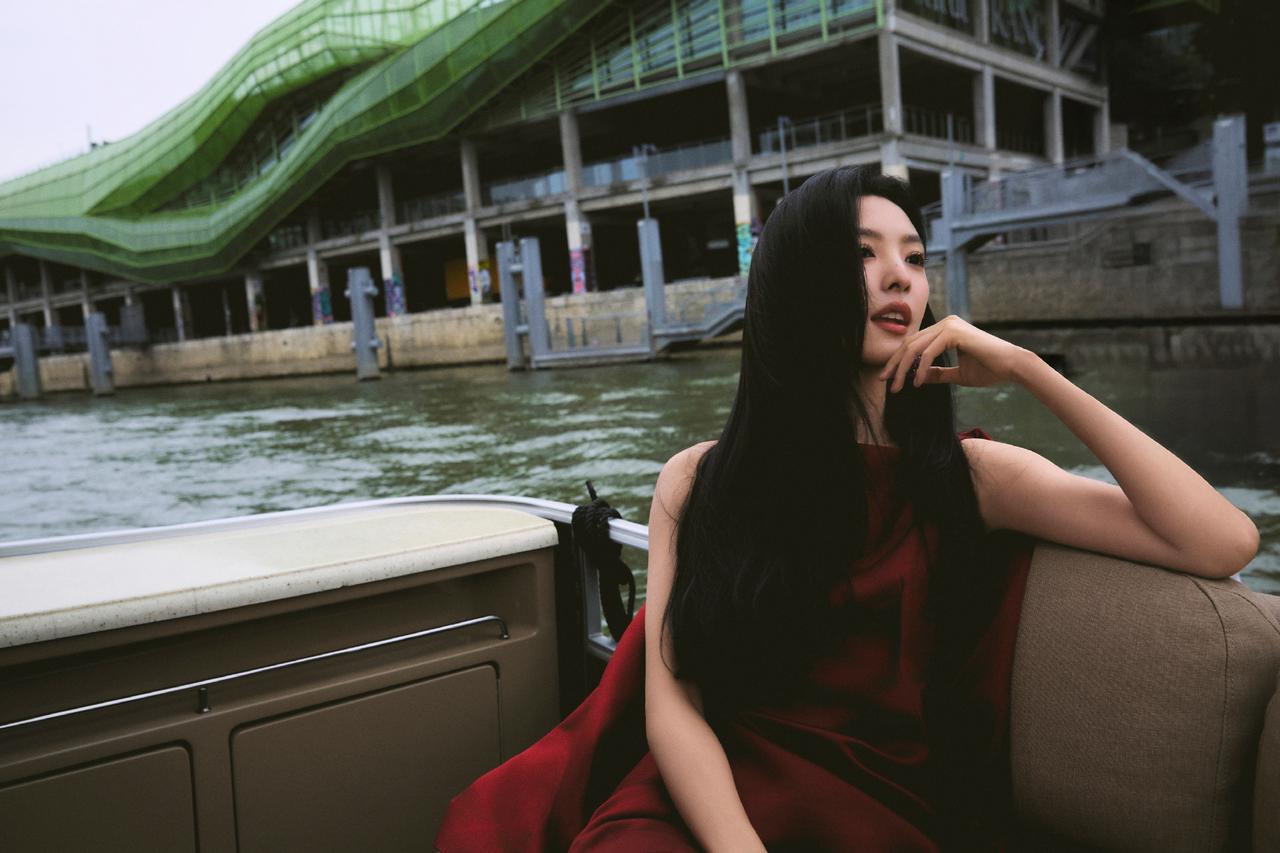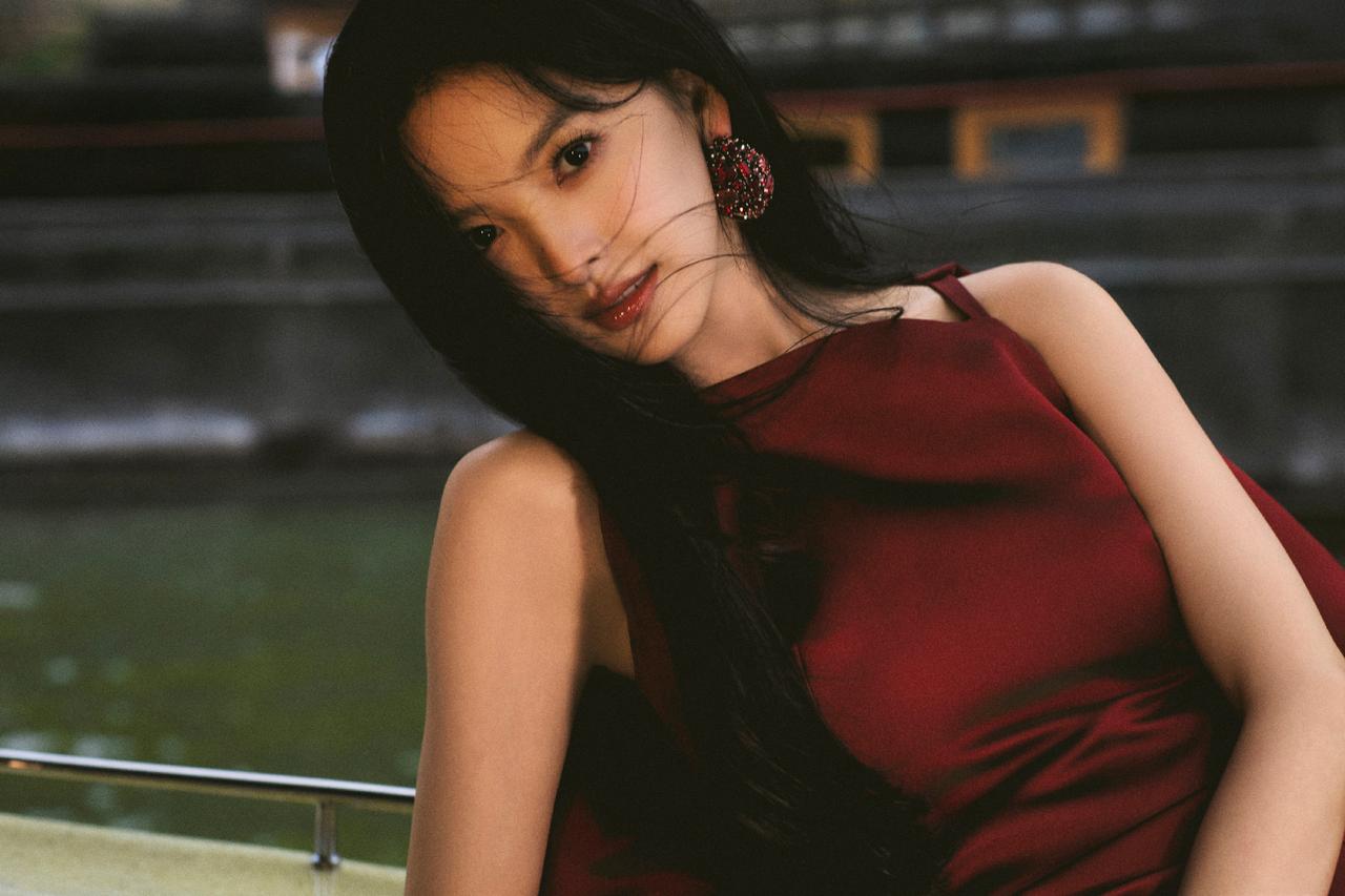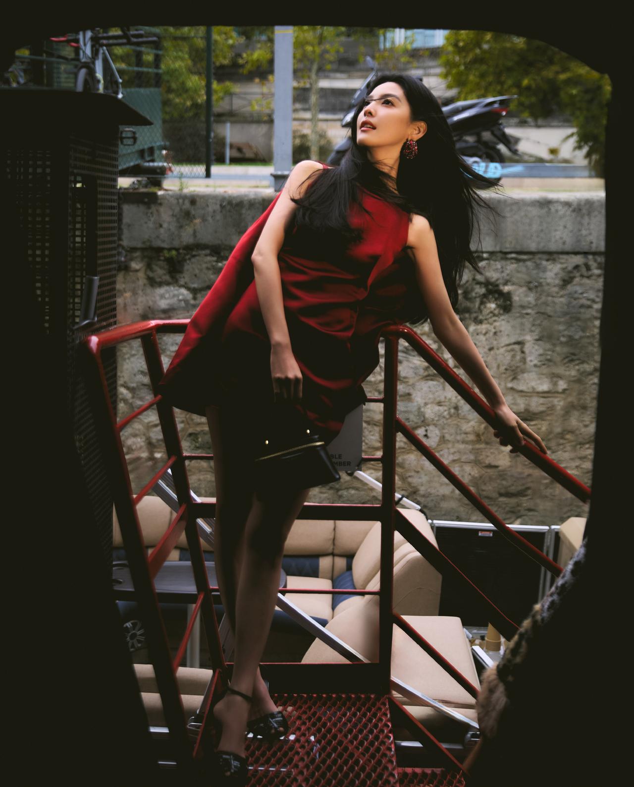酒红色与她的冷白肤色相互映衬,衬得肌肤白皙透亮,裙身线条贴合身形,勾勒出灵动的少