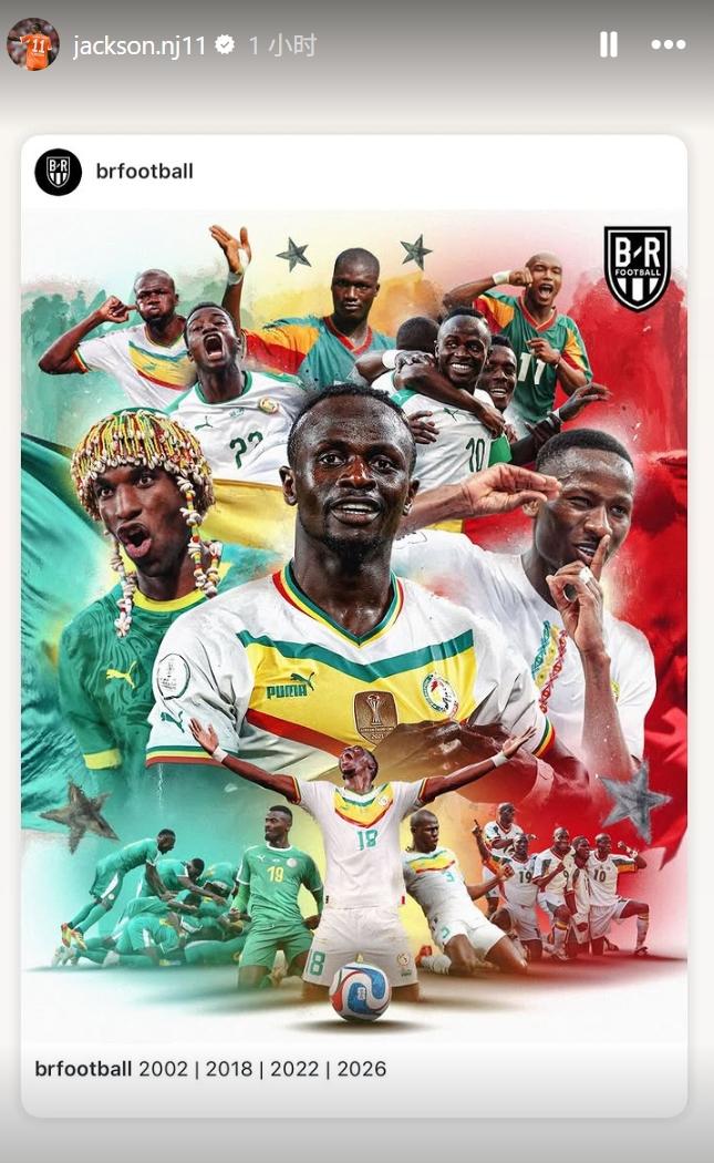 赛后,目前效力于拜仁的塞内加尔前锋尼古拉斯-杰克逊,在个人ins转发了BR足球制作的海报,庆祝祖国第四次杀入世界杯正赛。