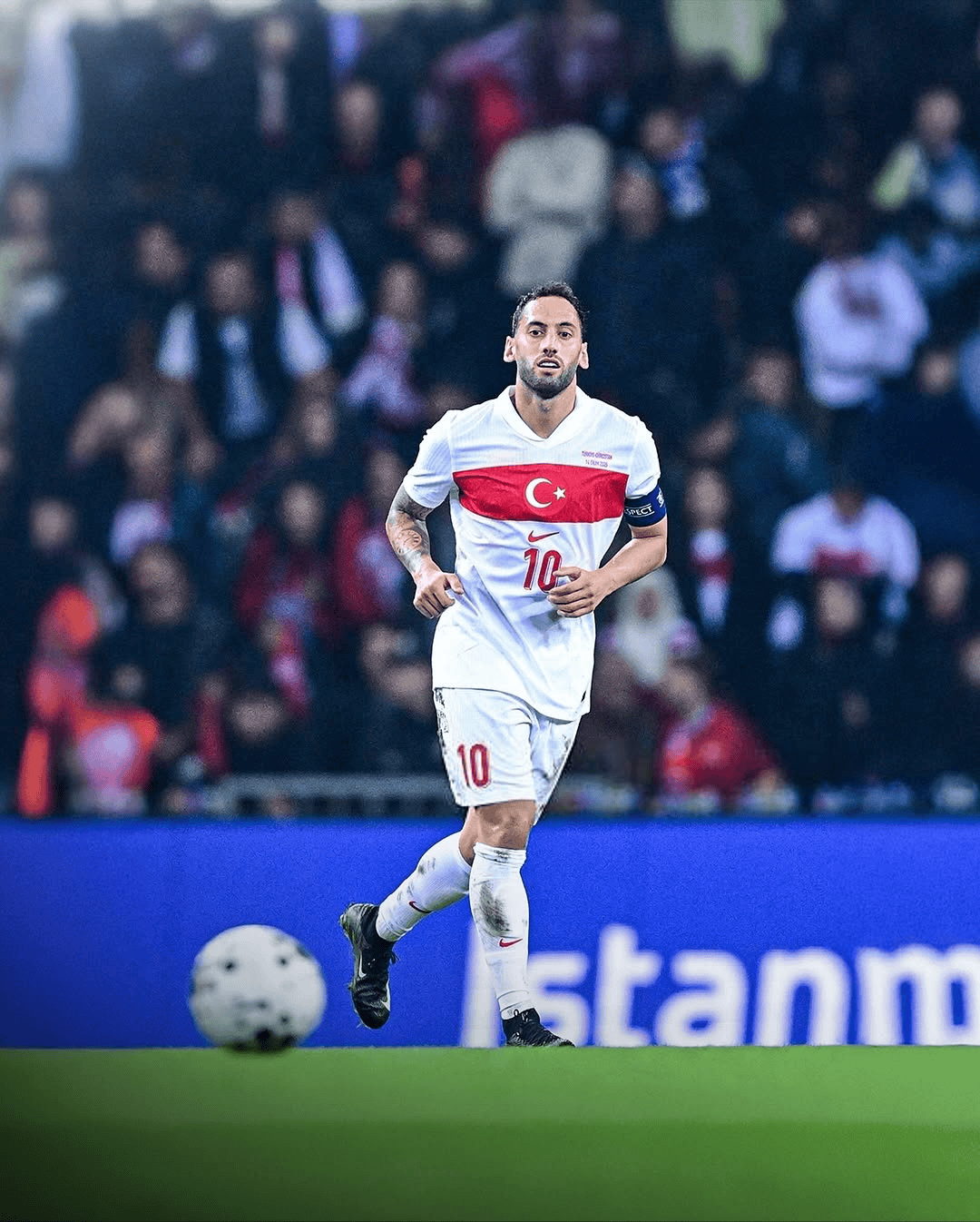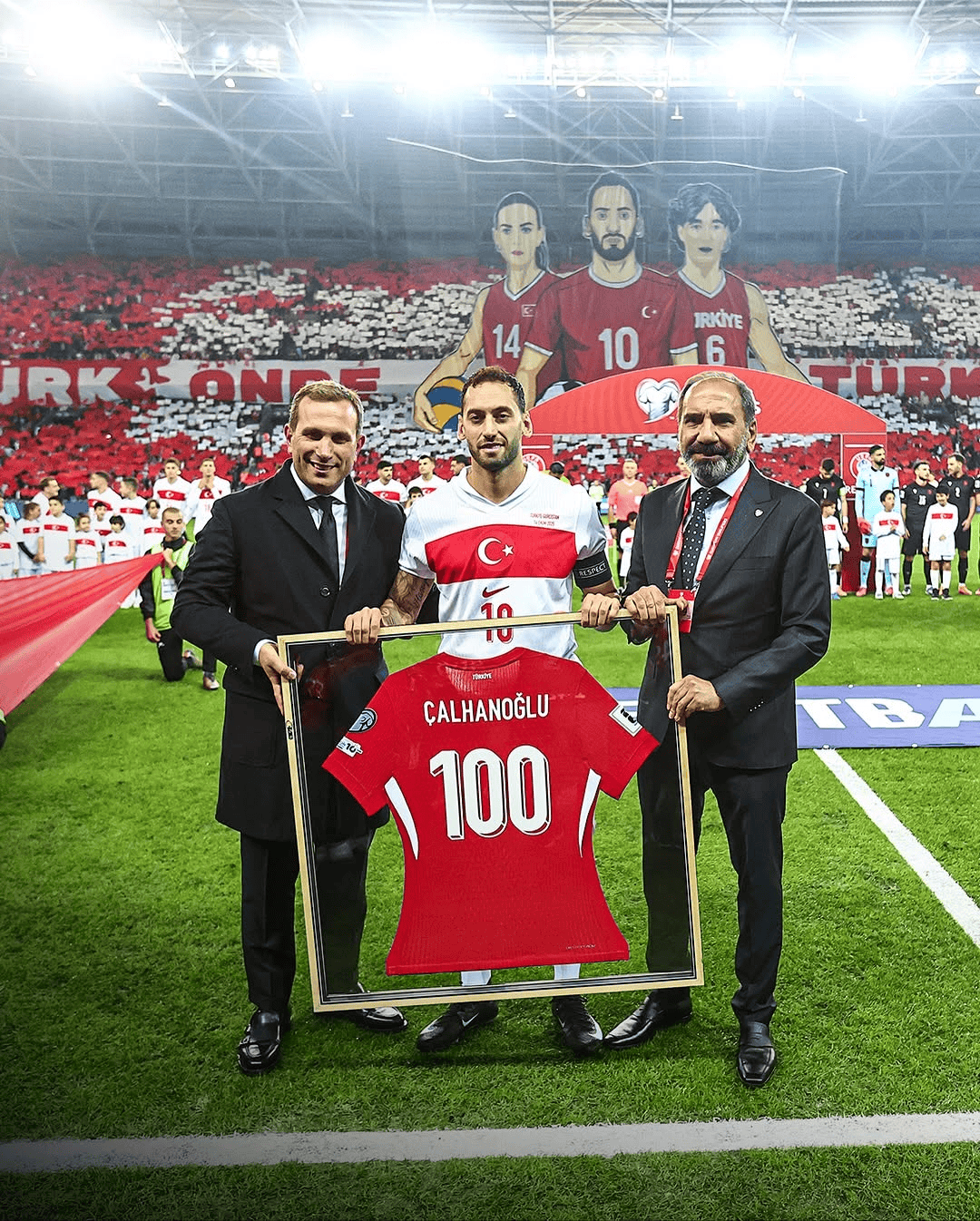 恰尔汗奥卢从2013年完成国家队首秀至今,已成为土耳其队中场的核心与精神领袖。本场比赛前,土耳其足协向他颁发了印有“100”的纪念球衣,全场球迷起立鼓掌致敬。
