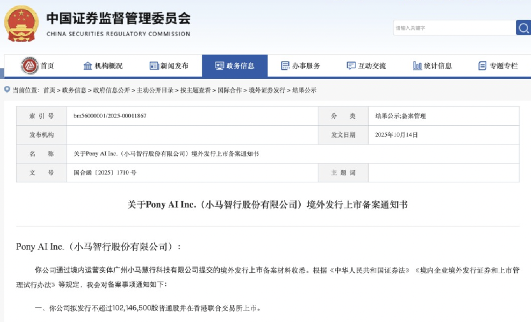 10月14日,中国证券监督管理委员会正式确认小马智行(PonyAIInc.)境外发行上市备案信息,明确其拟发行不超过102,146,500股普通股并登陆香港联合交易所。