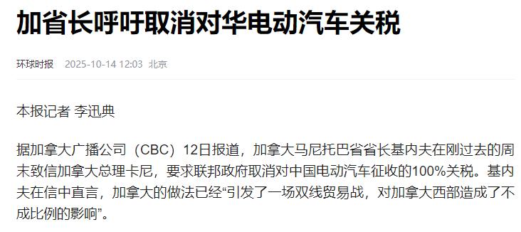 当地时间10月12日,加拿大马尼托巴省省长基纽和萨斯喀彻温省省长莫伊接连发声,急着要求联邦政府取消对中国电动汽车征收的100%关税。   这关税本来就来得莫名其妙,2024年8月26日,加拿大财政部突然宣布,从当年10月1日开始,所有中国产的电动车,在原来6.1%关税的基础上,再加征100%的附加税,最后税率直接飙到了106.1%。   给出的理由跟美国、欧盟一模一样,无非就是“中国产能过剩”“存在非市场行为”那套话,连加拿大媒体都忍不住批评这是跟着别人学舌的政治操弄。   这背后全是美国的影子。就在加拿大政府宣布征税的前一天,美国总统国家安全事务助理沙利文刚来过加拿大,还公开呼吁美加在电动车问题上“统一战线”,转头加拿大就出台了政策,说是独立决策,其实就是替美国火中取栗。   可讽刺的是,美国后来两次推迟了对中国电动车加税的决定,反倒把冲在前面的加拿大晾在了尴尬境地。   联邦政府做的决定,苦果全落到了马尼托巴和萨斯喀彻温这两个省头上。这俩省都是加拿大的农业命脉,萨斯喀彻温省是加拿大最大的油菜籽生产省,中国曾是该省第二大农产品出口目的地,2024年对中国的出口额还高达37亿加元,可到了2025年8月,这省对中国的出口直接跌到9600万加元,比去年同期跌了76%。   马尼托巴省更不好过,它是加拿大重要的猪肉生产基地,境内有北美规模最大的枫叶食品猪肉加工厂,可中国的反制措施让这里的生产商遭了重创,整个猪肉行业已经损失了1.2亿加元,有家猪肉企业直接报告每年要损失1900万加元。   基纽在给总理卡尼的信里说得很直白,这种做法“引发了一场双线贸易战,对加拿大西部造成了不成比例的影响”,关税多存在一天,草原省份的生产商就多受一天罪。   更荒诞的是,这关税压根没起到保护本国产业的作用,反而先坑了自己人。加拿大2023年进口电动车总共快95.4亿加元,中国是第二大来源,占了22亿加元,中国电动车靠着成熟的电池技术和性价比,本来很受加拿大消费者认可。   可100%的关税直接让车价翻倍,温哥华有个经销商的展厅里,以前热销的比亚迪海豹,加税后售价从4万加元涨到8万加元,半年只卖出3辆。   消费者不是不想买,是真买不起,2025年二季度加拿大电动汽车销量比去年同期暴跌39.2%,核心就是5.5万加元以下的低价车型彻底断供了。   不少经销商库存积压,生意一落千丈,加拿大汽车经销商协会早就抱怨过,补贴政策波动都能让销量下滑,更别说这种翻倍的关税了。更打脸的是,加拿大自己还在给汽车产业砸钱,给大众等公司的超级电池工厂提供370亿加元的补贴,却转头骂中国补贴“不公平”,这种双标连自家媒体都看不过去,直言这是让消费者补贴外国车企的利润。   而且加拿大本土根本没有成熟的电动车产业链,加税后反而更依赖美国、墨西哥进口,车企零部件采购成本还涨了19%,本土车企Lion Electric的产能连市场需求的10%都填不满,所谓的“产业保护”纯属空谈。   就连联邦政府喊的“绿色转型”口号,也被这关税戳破了。加拿大本来计划2035年实现新售汽车全零排放,可2023年零排放汽车的注册量只占11%,正是需要更多低价电动车推动普及的时候,却把最大的性价比来源拒之门外。   这种做法根本不是搞环保,而是叶公好龙,嘴上喊着减排,真见着中国的新能源技术来了,又急着封杀,既增加了自己的转型成本,又拖了全球清洁技术的后腿,典型的经济与气候双输。   民众的态度也早就变了,去年还有63%的人支持这个关税,现在只剩44%了,反对的人反倒升到了47%。大家慢慢看明白了,这关税保护的不是加拿大的利益,而是联邦政府讨好美国的私心。   毕竟美国自己都在犹豫要不要加税,还派沙利文来撺掇加拿大冲锋,结果加拿大当了出头鸟,反被中方反制打得满地找牙,连美国都没伸手帮忙,反而还威胁要对加拿大木材、乳制品加税250%。   现在两省省长急着发声,也是实在扛不住了。萨斯喀彻温省早就派省长莫伊带着议员访华,想推动中方取消油菜籽关税,马尼托巴省更是把农业损失算得明明白白。   他们手里还有个重要筹码,油菜籽、猪肉是西部省份的经济支柱,这些地区的选票向来是联邦选举的关键。安大略省的汽车经销商们还联合发起请愿,1.2万个签名直接送到了国会山,喊着“我们要的是选择权,不是被关税绑架”。   连联邦农业部长麦克唐纳都松了口,承认“支持农民是首要任务,关税调整势在必行”。   中国驻加拿大大使王镝也说得很明白,要是加拿大取消对中国电动车的关税,中方也会对等取消对加拿大相关产品的关税,这为解决争端提供了清晰的路径。