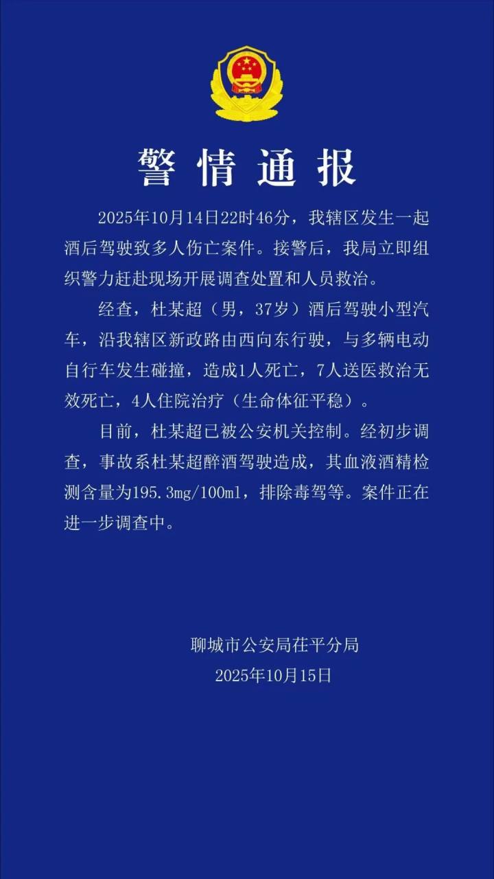 今天,山东聊城公安局茌平分局发布警情通报:10月14日22时46分,辖区发生一起酒后驾驶致多人伤亡案件。经查,杜某超(男,37岁)酒后驾驶小型汽车,沿辖区新政路由西向东行驶,与多辆电动自行车发生碰撞,造成1人死亡,7人送医救治无效死亡,4人住院治疗(生命体征平稳)。