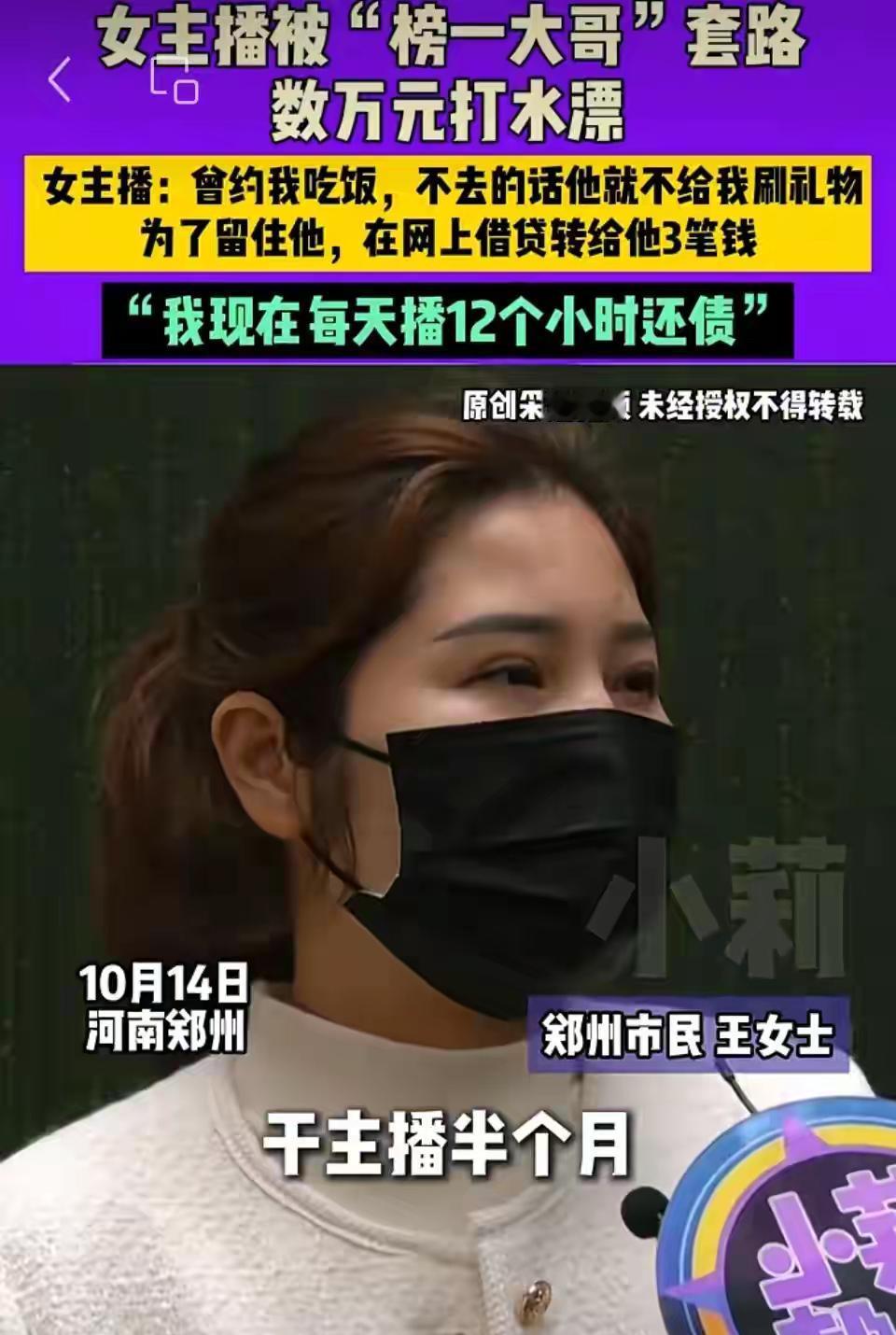 郑州这女主播的遭遇太让人唏嘘。王女士做主播时遇到榜一大哥,一开始大哥豪横刷礼物,一周就让她赚3000多。大哥约吃饭,不见就不刷礼物,王女士赴约后关系拉近。之后大哥以投资担保缺钱为由借钱,王女士三次用花呗借了5万多。结果到还钱时,大哥消失得无影无踪。 这不是个例,山东、南京也有女主播被榜一骗钱,抖音这类举报比去年多两倍多。骗子套路深,先打赏再借钱。平台也不管,女主播们本就收入不稳定,容易被表象迷惑。大家别光说女主播傻,也得问问平台为啥不提醒风险。 主播骗局 主播的真相 主播的遭遇 直播榜一大姐 主播踩坑