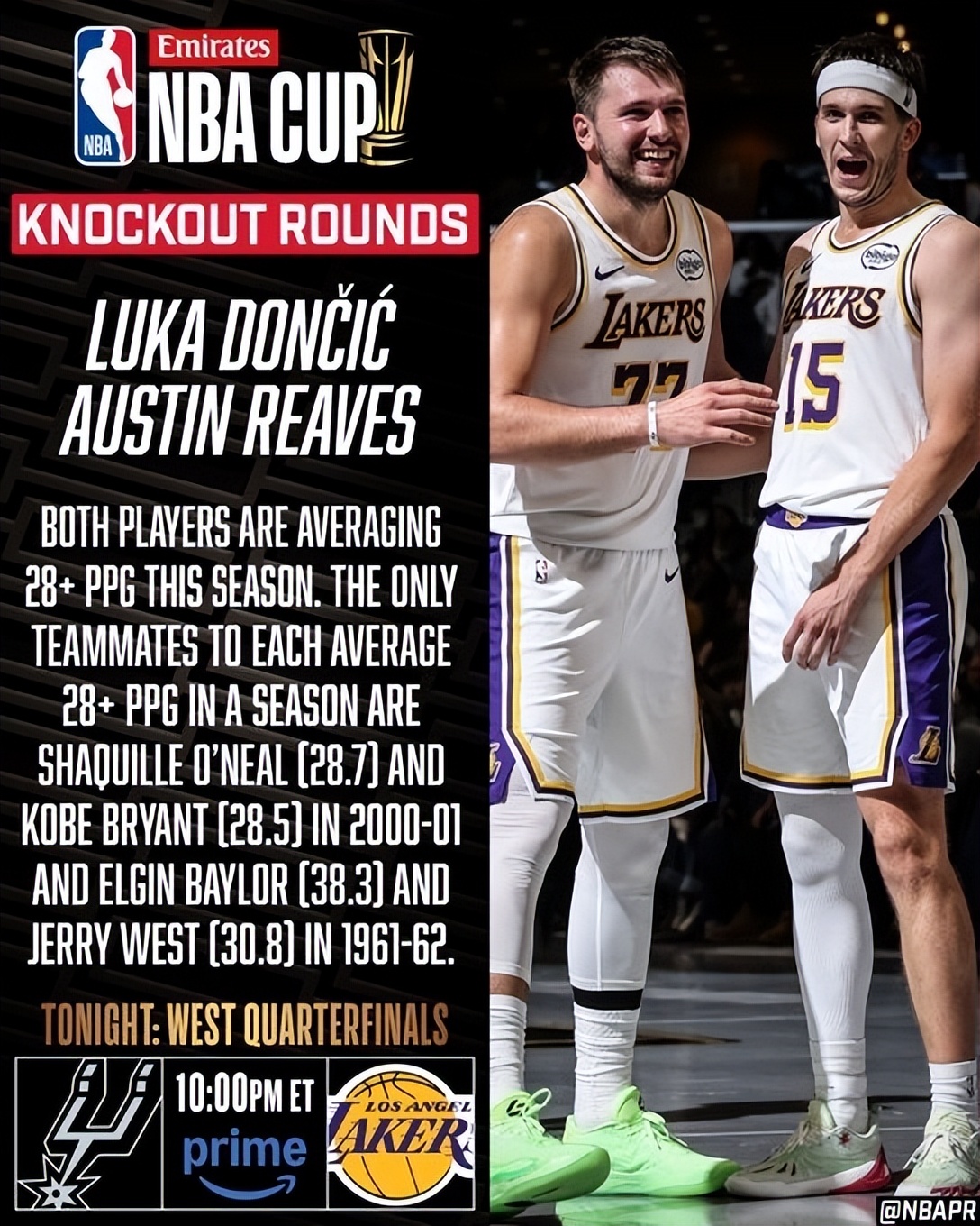 在NBA历史上,单赛季场均都超过28分的队友组合也只有00-01赛季的奥尼尔(28.7分)与科比(28.5分),以及61-62赛季的埃尔金·贝勒(38.3分)与杰里·韦斯特(30.8分)。值得一提的是,这两对二人组都是湖人的,而东契奇和里夫斯同样也是湖人的。