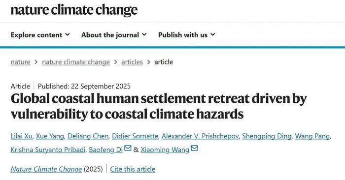 四川经济网讯(记者胡敏)近日,四川大学灾后重建与管理学院徐礼来副研究员、第宝锋教授与合作者在气候变化领域国际顶尖期刊NatureClimateChange发表了题为《Globalcoastalhumansettlementretreatdrivenbyvulnerabilitytocoastalclimatehazards》的最新研究成果。该研究揭示了近30年全球海岸带人类住区的迁移模式及其与气候脆弱性的关系,为沿海气候适应政策制定提供了科学依据。