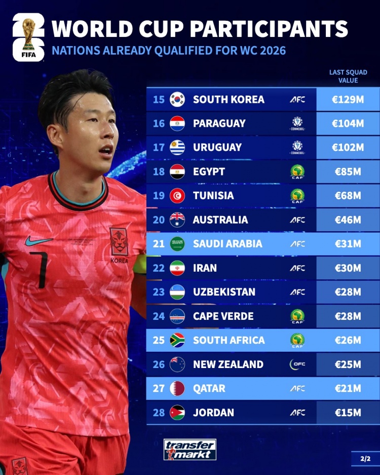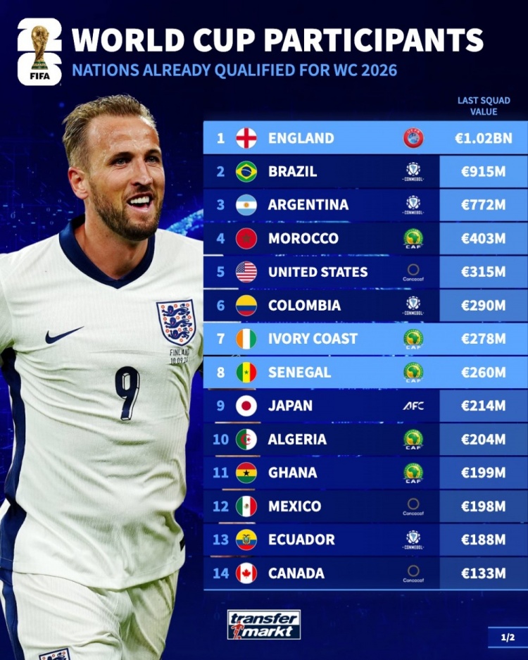 锁定世界杯资格球队身价排名(新一期名单)