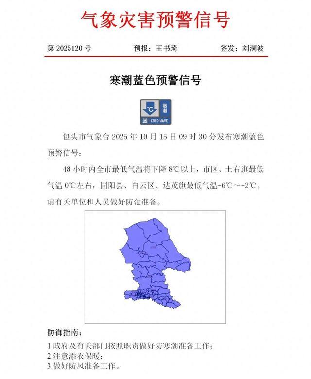 包头市气象台今日9时30分发布寒潮蓝色预警信号:48小时内,包头最低气温将下降8℃以上,市区、土右旗最低气温0℃左右,固阳县、白云矿区、达茂旗最低气温-6℃~-2℃。