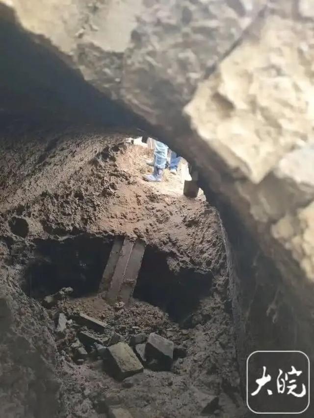 安徽省文物考古研究所专家正在现场指导发掘工作。历经千年,东侧大墓墓室内被泥土填埋,发掘过程中,墓室内外泥土里有许多蚂蚁窝。现场人员正在打开大墓墓顶,清理墓室内的泥土。