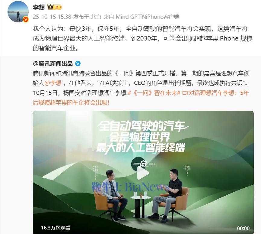 李想还强调,到2030年,可能会出现超越苹果iPhone规模的智能汽车企业。