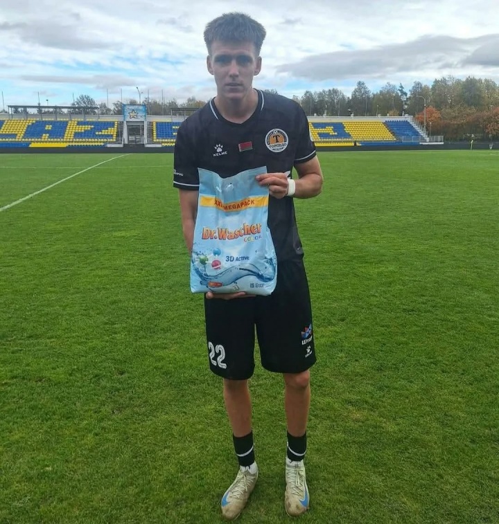 白俄罗斯球员领取全场最佳奖品——一袋洗衣液