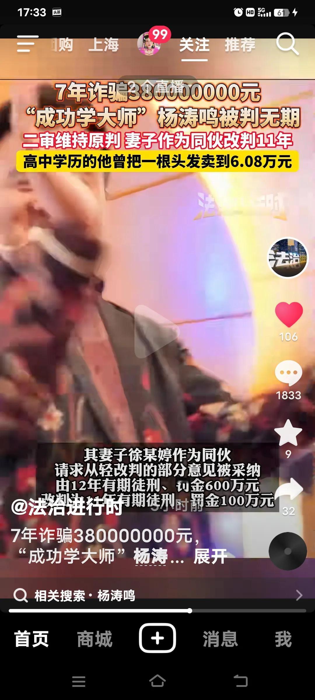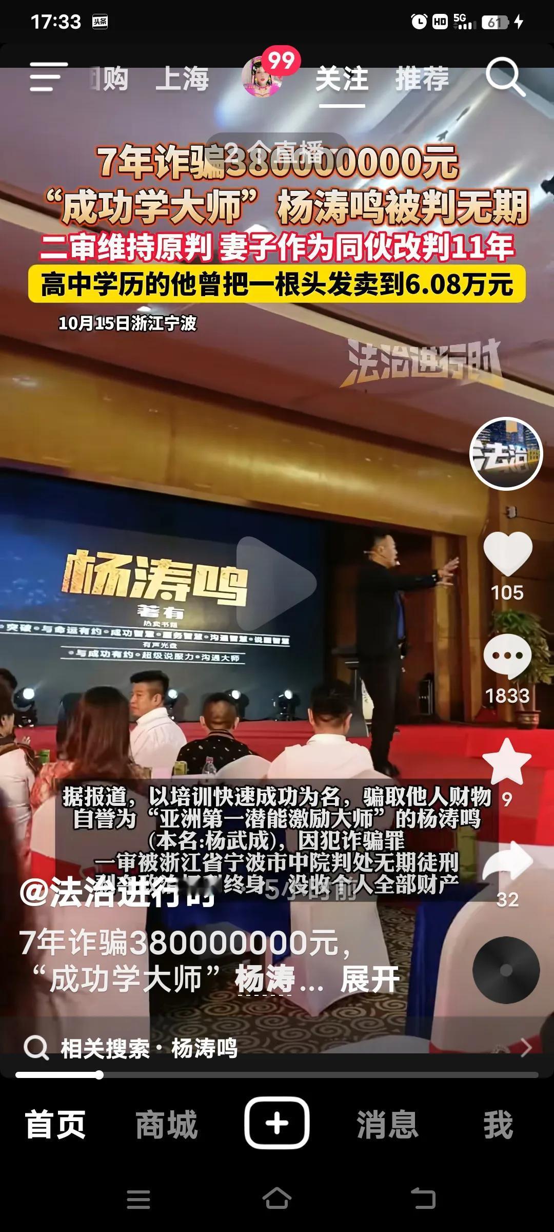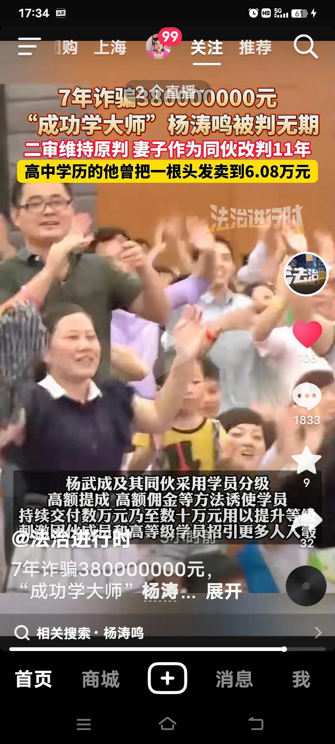 所谓“犯罪天才必有一死”有点偏差,“成功学大师”杨涛鸣(本名杨武成)7年诈骗3.8亿,一审被判无期徒刑,剥夺政治权利终身,没收个人全部财产! 他把自己包装成“亚洲第一潜能激励大师”,用虚立人设、制造假象、编造案例等手段,高价兜售培训课程。还让学员分级,用高额提成诱惑学员不断交钱升级。高中的学历,他曾一根头发能卖6.08万元。 好多人刷信用卡、借钱去听课,结果内容重复,毫无用处,还债务缠身。这种打着成功旗号行骗的人,就该受到法律严惩,让他的“成功学”骗局彻底破灭! 其妻子徐某婷作为同伙同伙被 判12年有期徒刑,罚款600万元,妻子请求减轻改判的部分意见被采纳,最终被11年罚款100万元。这都是咎由自取的结婚果!杨鸣涛骗局案 杨鸣涛
