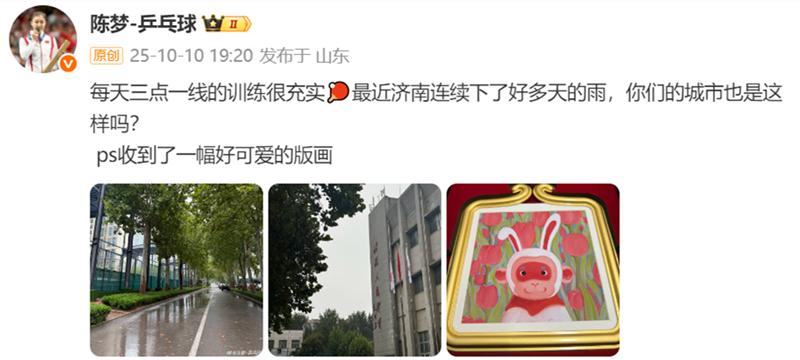 好久不见,陈梦社媒发文了! 10月11日消息,奥运冠军陈梦昨晚更新动态,晒出了自己近来的最新情况,梦姐说她过得很充实,每天三点一线保持着训练,她还说济南最近一直下雨,还收到了一幅可爱的版画。 看得出来,梦姐的心情还不错,最近都在积极训练以备战11月份的全运会,生活忙忙碌碌,但也充充实实;确实,梦姐说得没错,山东河北这一地带最近都在下雨,每天的雨不停,降温也很明显,不知你们所在的城市也是这样吗? 说起来,陈梦已好久都未出现在赛场上了,她上一次正式比赛,还是在2024年12月份的老瓦杯友谊赛上,可见我们确实已好久没看到梦姐打比赛了,而好消息是就快要看到了,那就让我们期待着吧,也希望梦姐能天天开心,不受有些舆论的影响!