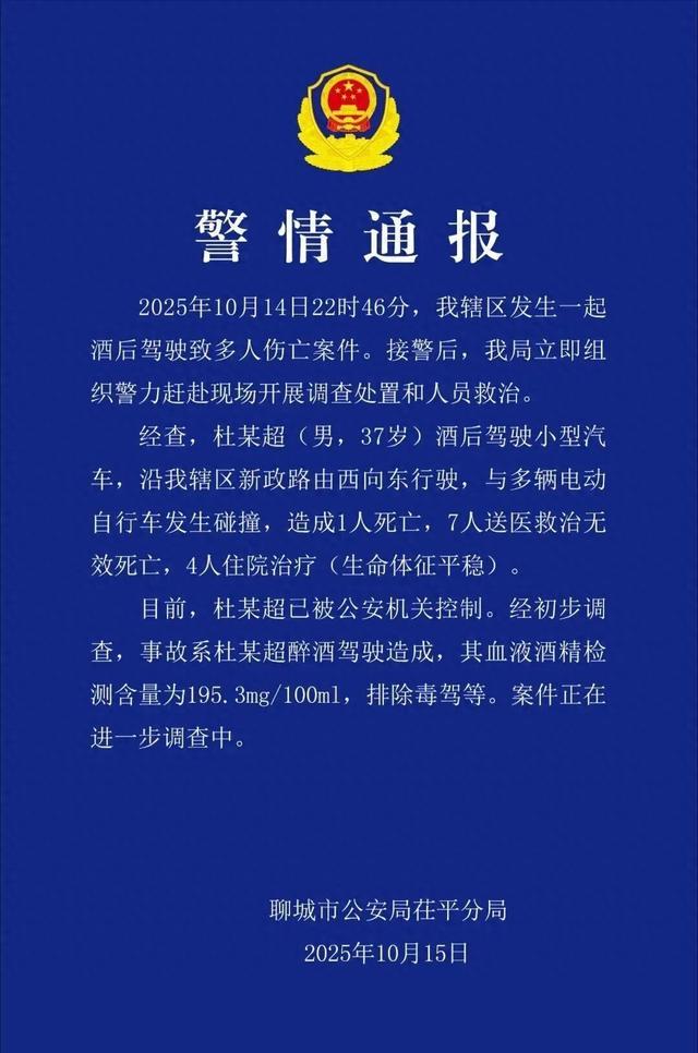 今天(15日),山东聊城公安局茌平分局发布警情通报:10月14日22时46分,辖区发生一起酒后驾驶致多人伤亡案件。经查,杜某超(男,37岁)酒后驾驶小型汽车,沿辖区新政路由西向东行驶,与多辆电动自行车发生碰撞,造成1人死亡,7人送医救治无效死亡,4人住院治疗(生命体征平稳)。