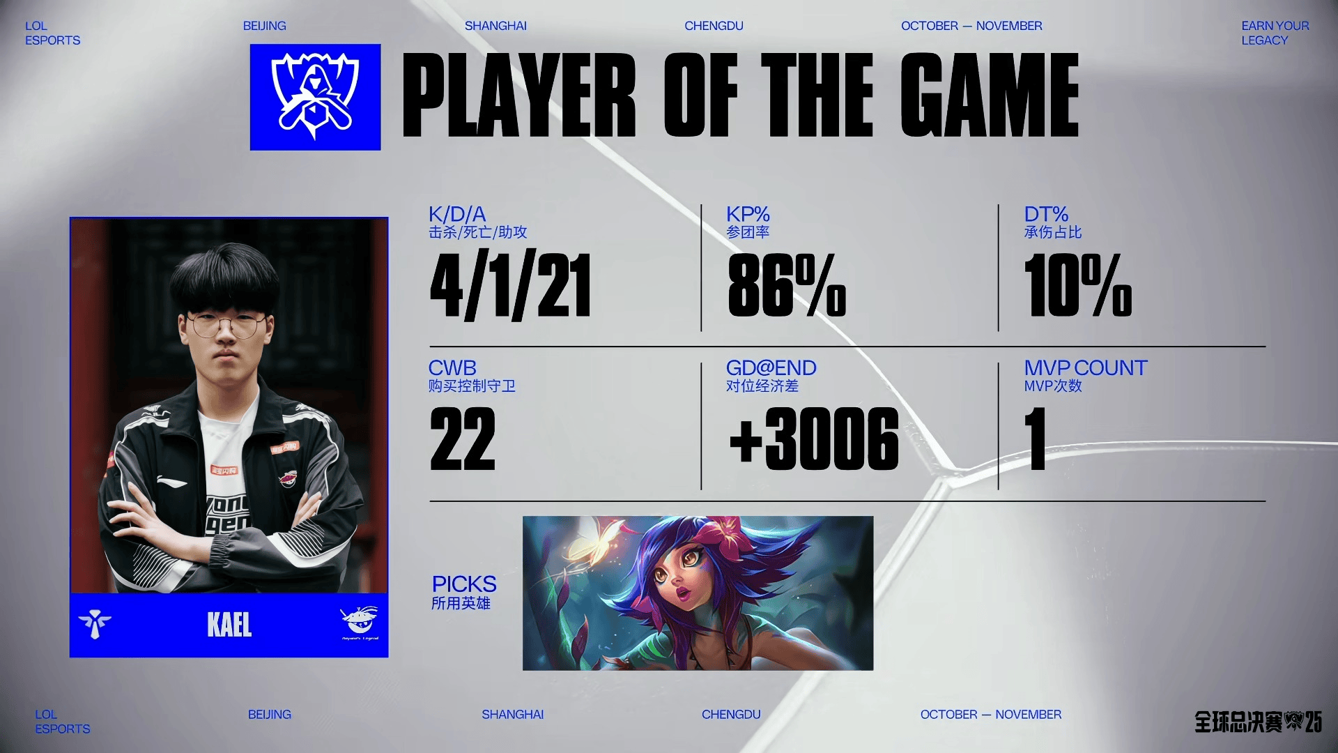 虎扑10月15日讯在刚刚结束的S15瑞士轮的比赛中,Kael妮蔻砍下4/1/21的战绩,拿下AL对阵HLE首局MVP