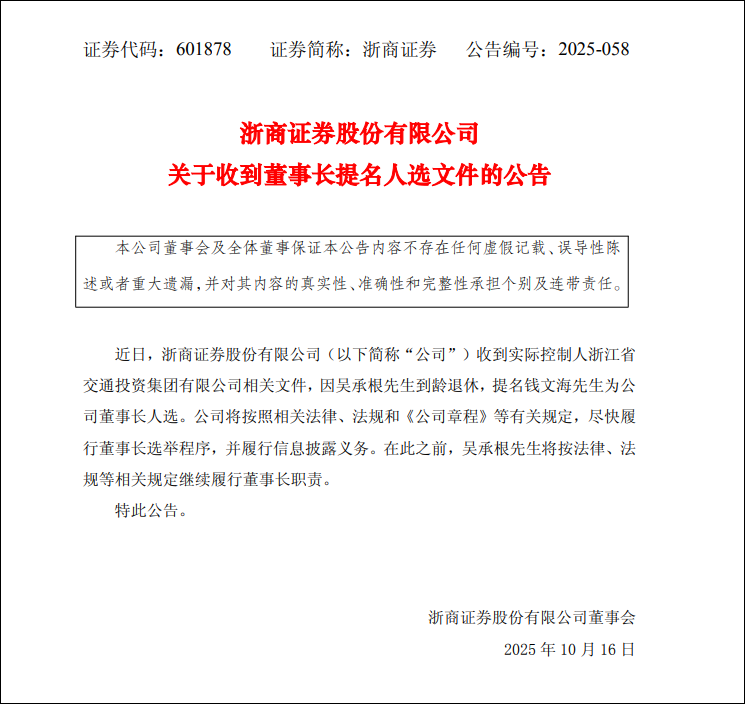 今日晚间,浙商证券发布公告称,“近日,浙商证券股份有限公司收到实际控制人浙江省交通投资集团有限公司相关文件,因吴承根先生到龄退休,提名钱文海先生为公司董事长人选。”