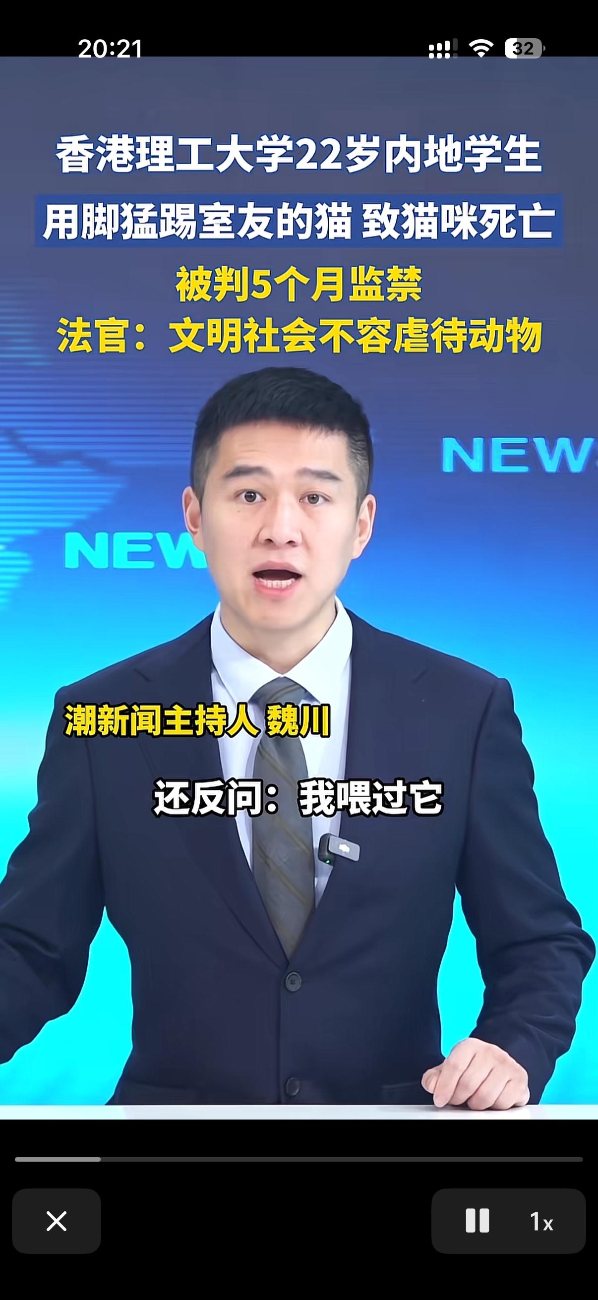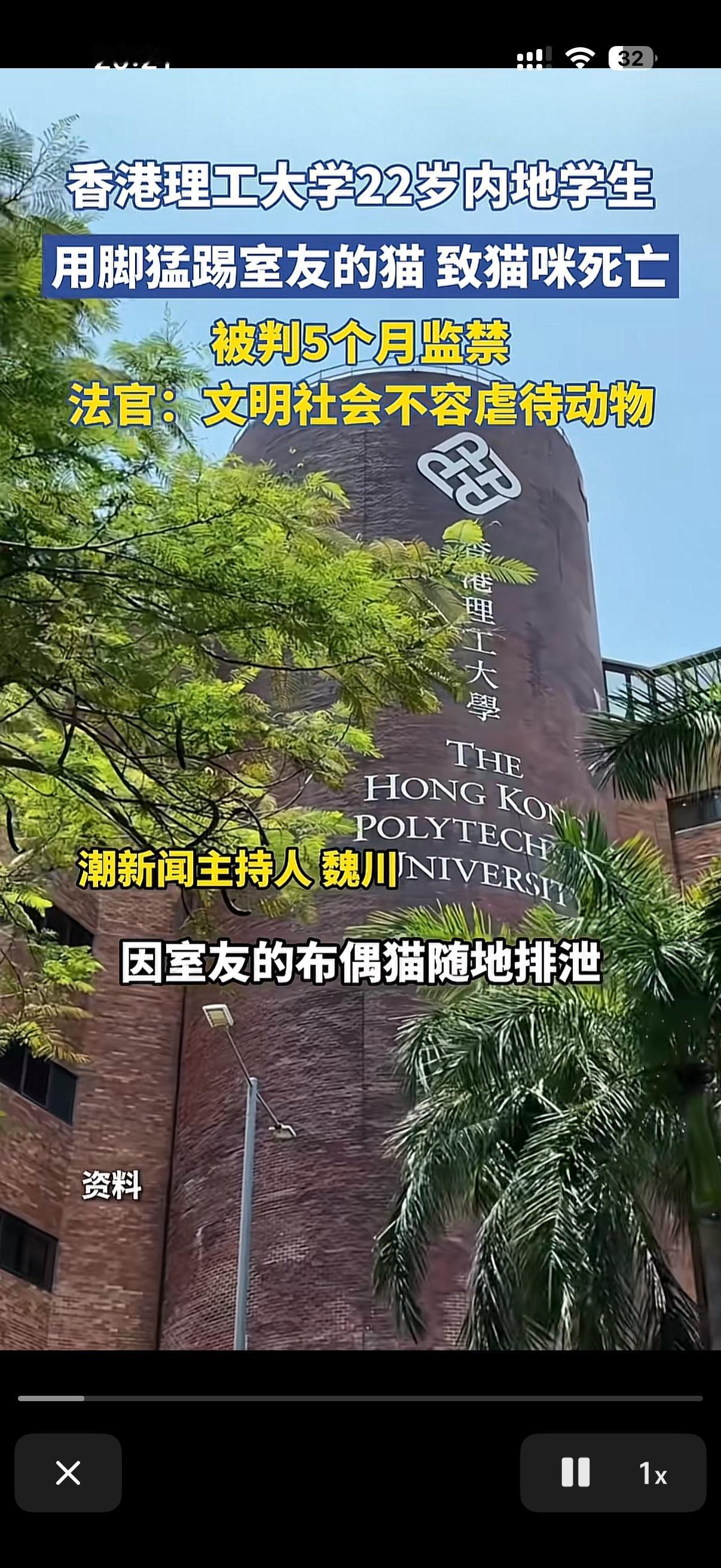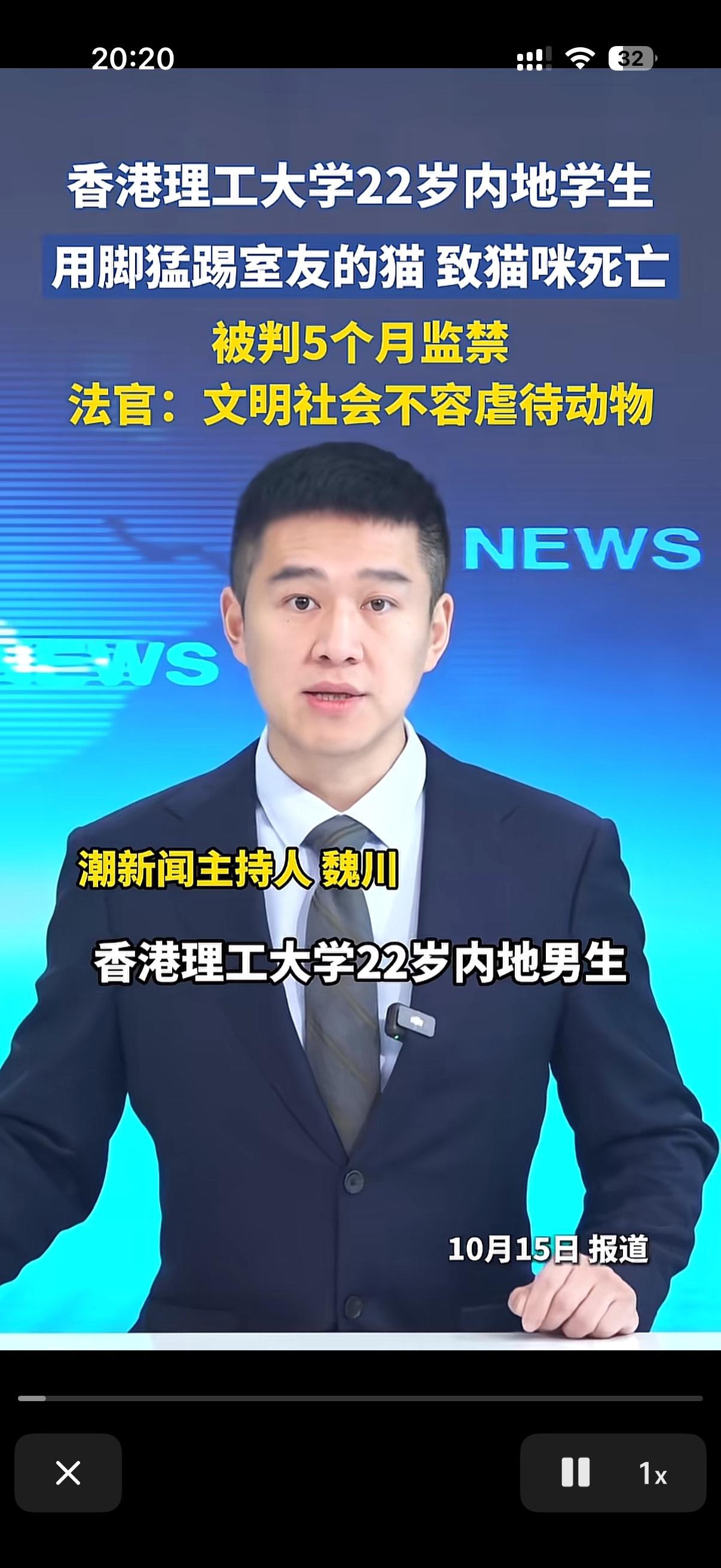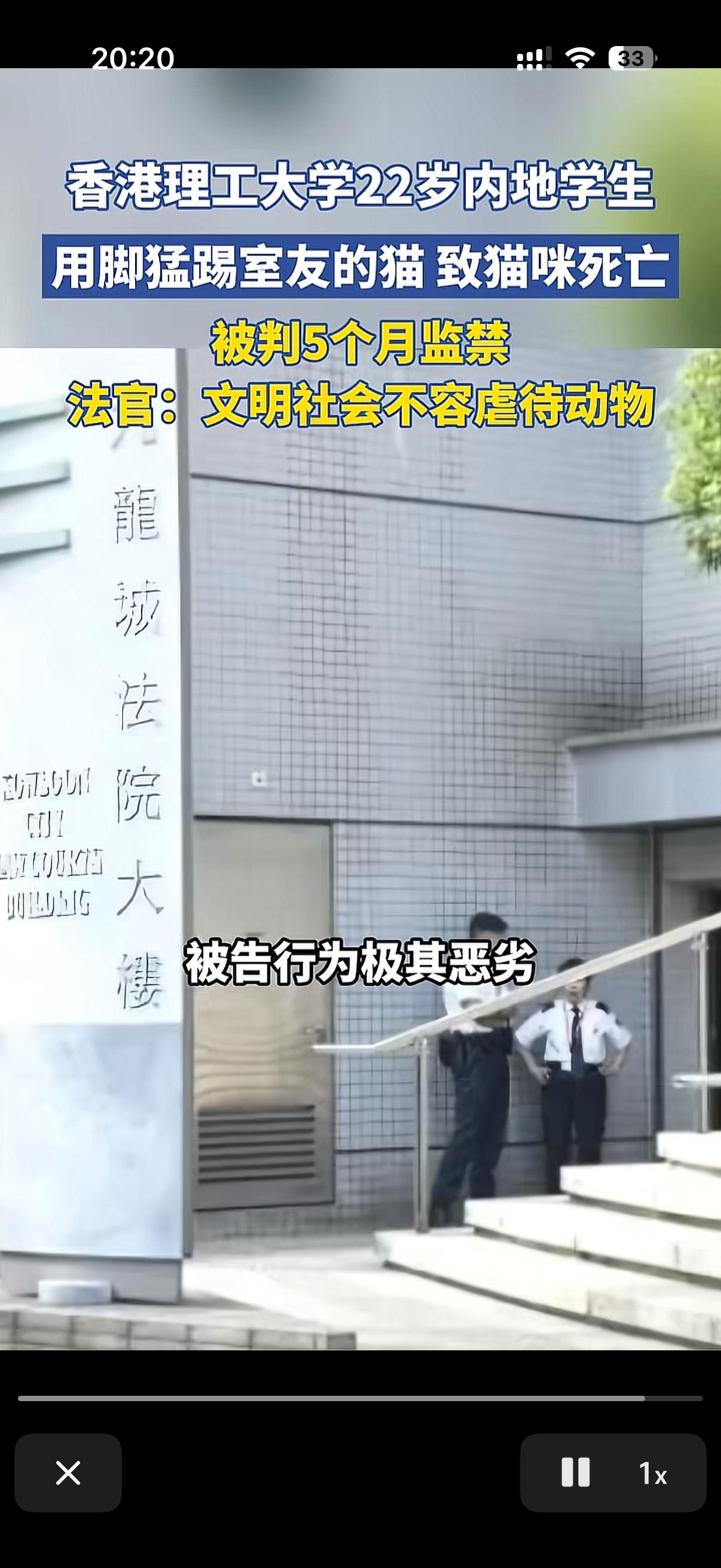 内地一男大学生,因虐待猫咪在香港被判监禁五个月! 这名被告男子在接受审判的时候态度极其嚣张恶劣! 声称我喂这猫了,怎么就不能打了? 法官最终宣判改名留学生五个月监禁! 有些人以为在内地可以肆无忌惮,别的地方也不能拿自己怎么样! 希望以后内地也可以和香港一样,毕竟有现成案例了! 法官称虐待动物这是文明社会不能容忍的!虐待猫 虐猫致死
