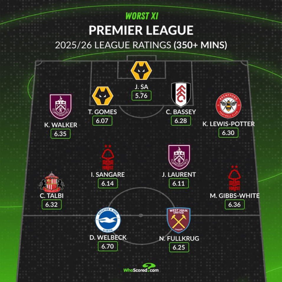 虎扑10月15日讯Whoscored根据球员评分,评选出了本赛季目前英超联赛里最令人失望的阵容,入选该阵容的球员出场时间都不少于350分钟。