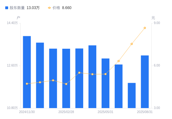 日期A股户数(户)流通A股户均持股数(股)户均持股市值(万元)2025-09-3014093121929.9622.632025-08-3113029223720.6520.542025-07-3111865126047.9219.612025-06-3012646824437.8915.442025-05-3112902223954.1412.942025-04-3013457922965.0412.382025-03-3113324523194.9512.762025-02-2813316123209.5810.912025-01-3113318623205.2311.512024-12-3113571322773.1410.98