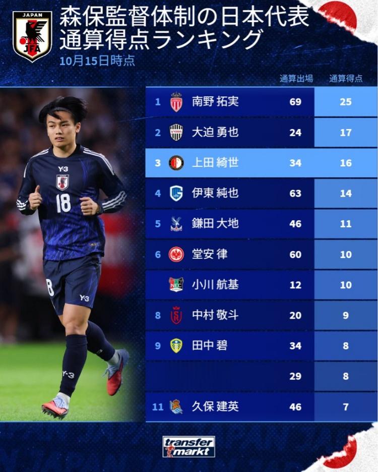 今日德转列出了森保一治下日本队射手榜情况,其中南野拓实以25球居首,大迫勇也和上田绮世分别以17球和16球列二三位,“鹭沼兄弟”三笘薰和田中碧均打入8球并列第9位,久保建英7球排第11位。