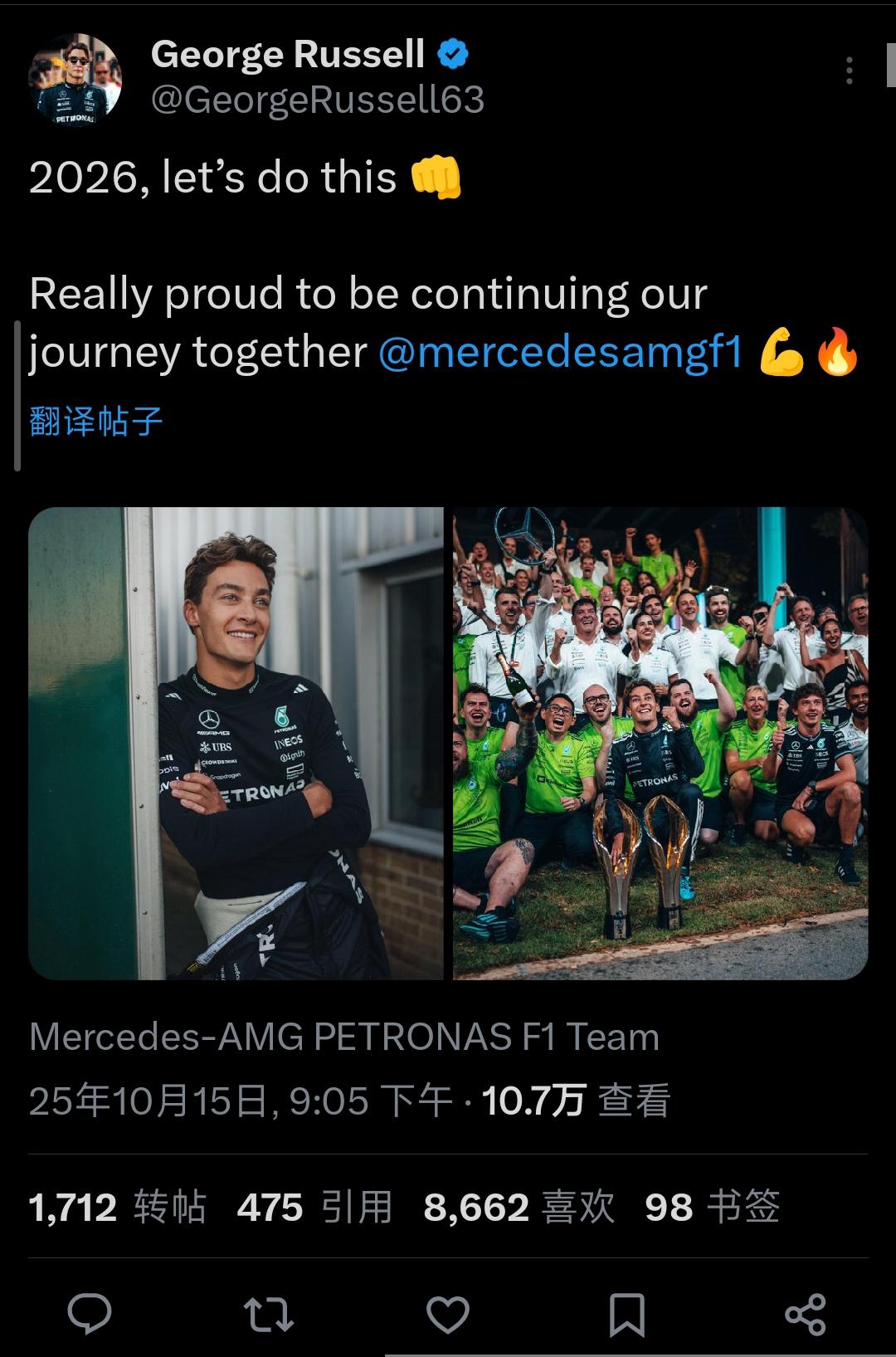 虎扑10月15日讯在梅赛德斯官宣乔治-拉塞尔和基米-安东内利将继续代表车队征战2026赛季F1后,拉塞尔更新了个人社媒表达了兴奋与期待。