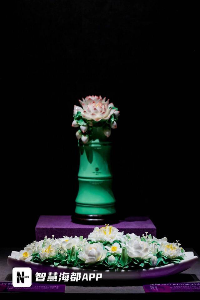 另一系列作品《虚谷长馨之荷花》则以“竹节+荷花”创意组合展现独特韵味。竹节采用传统工艺雕刻成型,搭配中性氛围技艺烧制,凸显竹子“谦虚谨慎、高风亮节”的文化内涵与“节节高”的向上精神;竹节上方纯手工捏制的荷花,经高温釉下彩工艺烧制后栩栩如生,取“出淤泥而不染”之意,象征清洁高雅与坚韧不拔,竹节的绿色基调还赋予作品“希望、活力、健康、安全”的寓意。