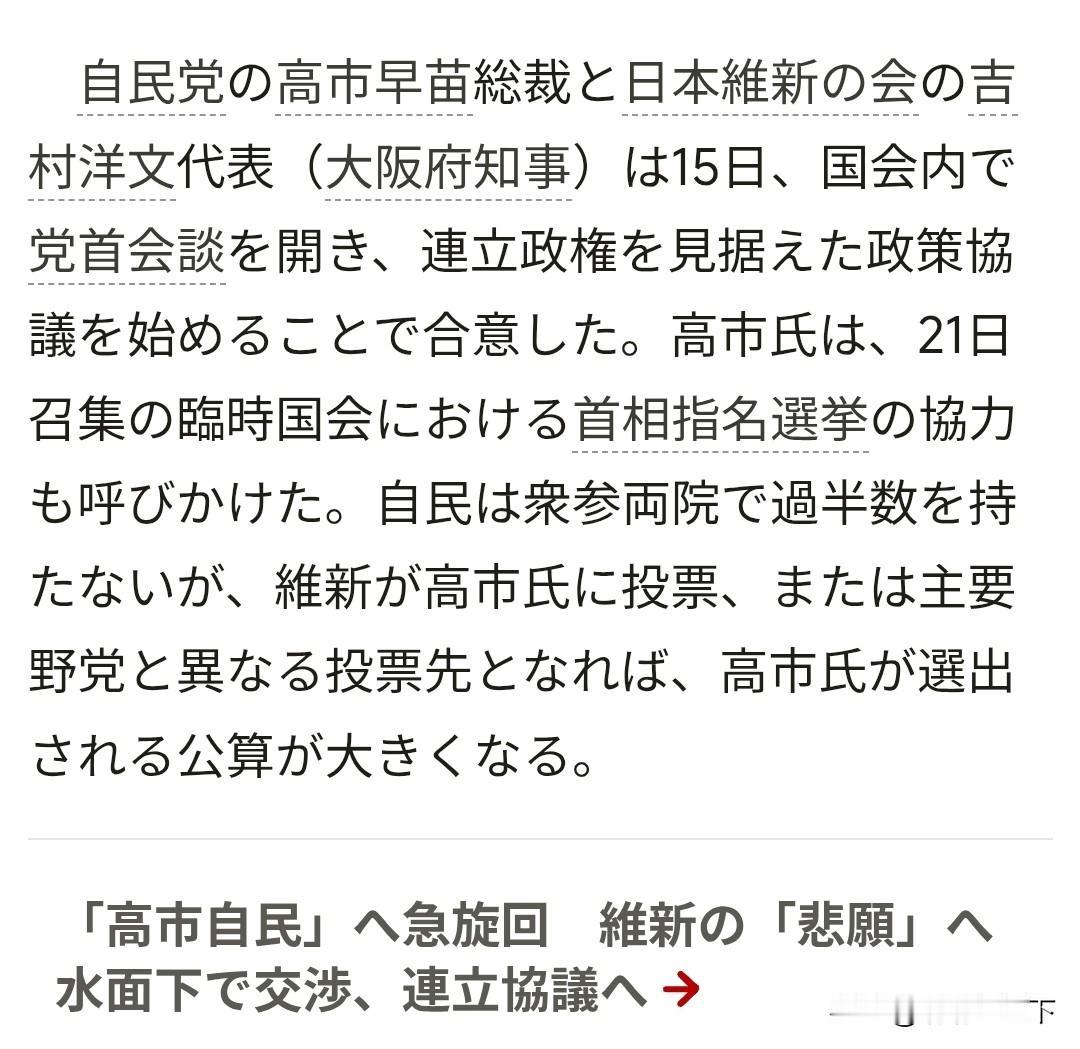 极右政党➕极右政客, 日本政坛也许挡不住高市早苗上台。 据朝日新闻10月15日晚间报道, 日本极右政党日本维新会已经在与日本自民党接触,协议建立联合政权。 日本维新会的代表,吉村洋文(大阪府知事),已经跟高市早苗见面,双方同意开始建立联合执政的协议程序。 10月10号,公明党的奋力割席,让我们稍微松口气,以为日本的自愈功能能让他们远离疯狂试探,把他们拉回到较为理智的路上。 没想到5天之后, 他们就跟更危险的日本维新会搞到了一起。 饮鸩止渴的日本,会为亚洲带来什么呢?