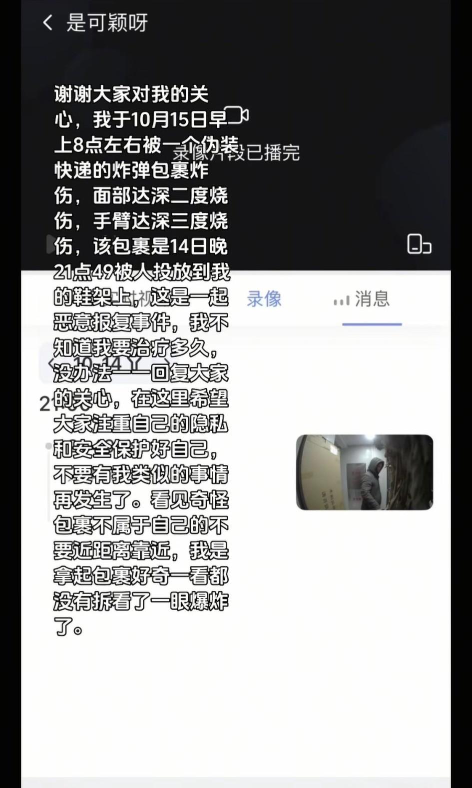 网红女主播疑是被快递炸伤事件! 当事人:我于10月15日早上8点左右被一个伪装快递的爆炸物包裹炸伤,面部达深二度烧伤,手臂达深三度烧伤,该包裹是14日晚21点49被人投放到我的鞋架上,自己拿起包裹好奇一看,都没有拆开就爆炸了…… 当事人称:这是一起恶意报复事件! 从当事人发出的视频显示:快递投递人已经找到了,从服装看好像不是快递公司的,应该就是寄快递的,我们且让子弹再飞一会儿。 当事人称是“爆炸物”好像说的太严重了吧,如果是爆炸物,那这个事情就有点大了,警方早就介入了! 目前,以上都是当事人的一面之词,我们且看有没有后续,看看官方有没有通报出来! 就是可惜了她如花似玉的五官了,但愿能修复好!不过还是要佩服她的,15号被炸伤,16号凌晨就拍视频发网上了!