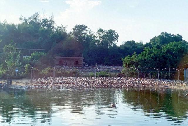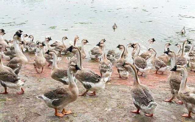 来到鱼塘,水下的鱼群听到声响便四散游去,水面哗啦作响。“嘎嘎嘎——”壮硕的鹅群羽毛光亮,在岸边昂首挺胸。
