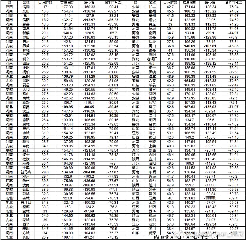 【黄淮等地日照显著偏少】最近1个月(9月16日-10月15日),陕西河南山东江苏安徽湖北一带,阴雨多、光照少。部分站点累积日照不到30小时,也就是平均每天日照不到1小时,比如河南信阳、驻马店、湖北襄阳、宜昌、安徽阜阳都是如此,比常年同期偏少了80%左右。