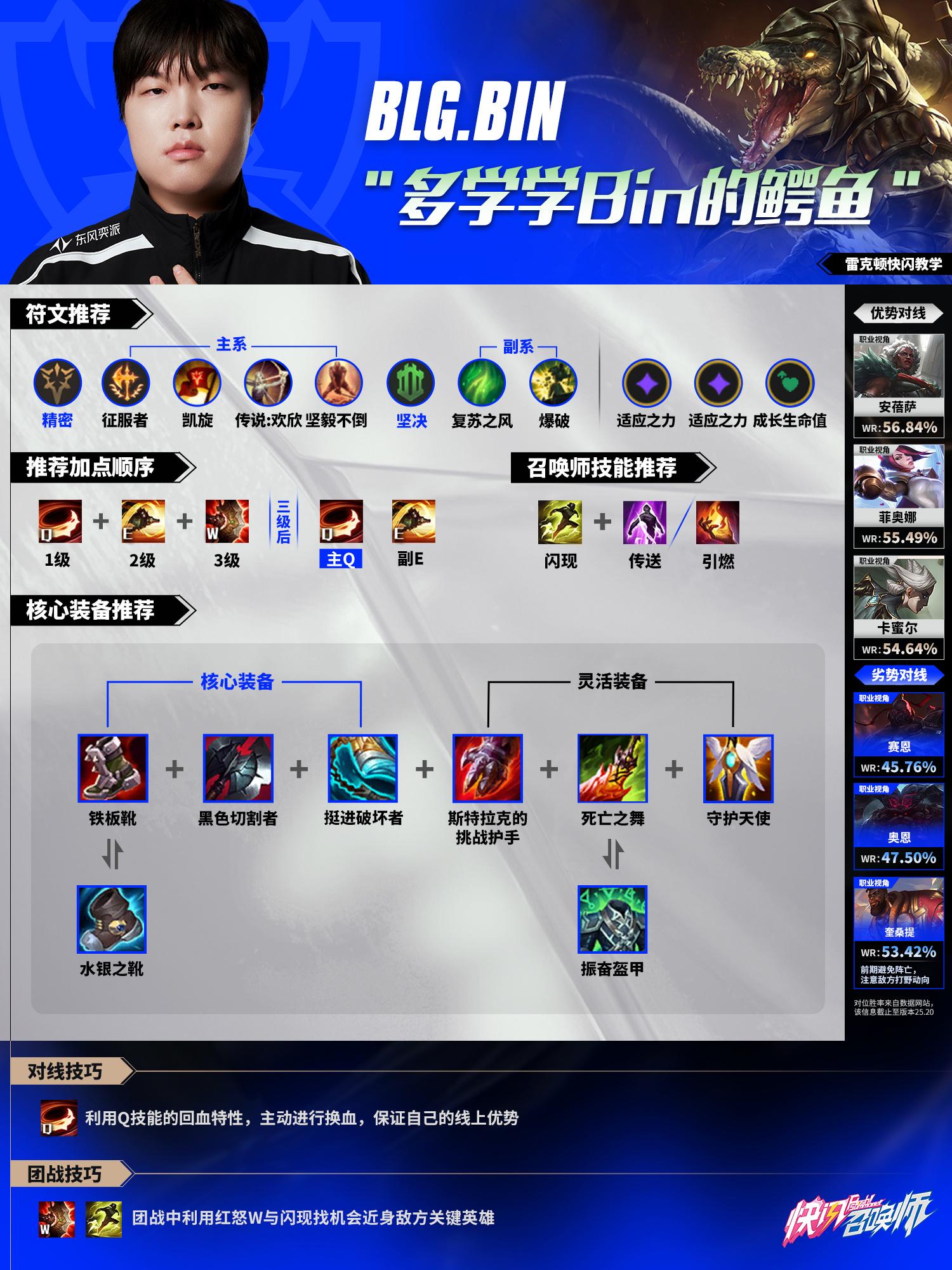 Bin的「荒漠屠夫雷克顿」亲传,靠Q回血换血拿优势,团战红怒W闪现切人,总之“多学学Bin的鳄鱼”!
