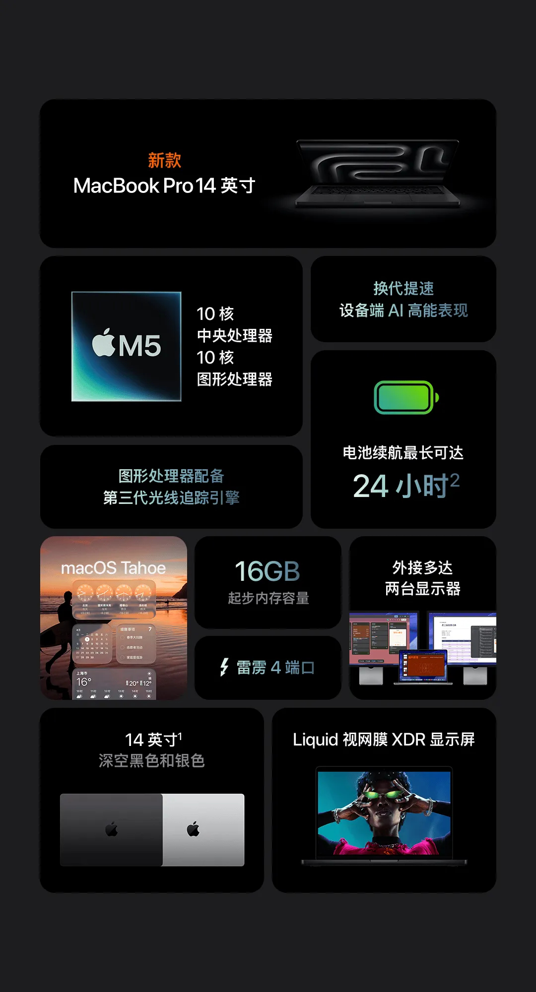 M5芯片 来了,主要是AI方面的提升比较大,苹果也带来搭载M5芯片的三款新品,MacBook Pro、iPad Pro和Vision Pro,17号接受预定,22号发售[并不简单]