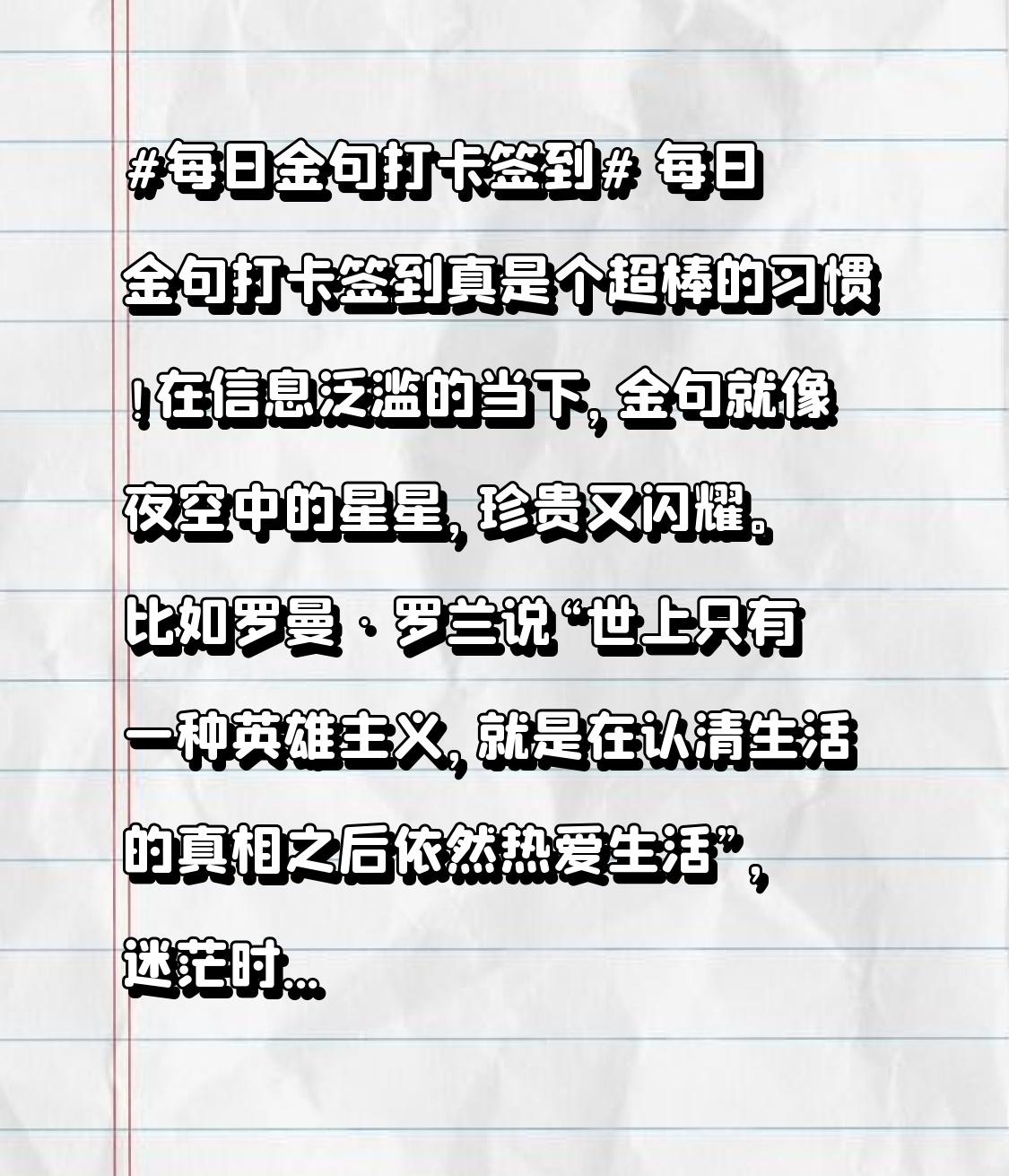 每日金句打卡签到真是个超棒的习惯!在信息泛滥的当下,金句就像夜空中的星星,珍贵又闪耀。比如罗曼·罗兰说“世上只有一种英雄主义,就是在认清生活的真相之后依然热爱生活”,迷茫时读到它,瞬间就有了力量。 有调查显示,超70%的人读正能量金句后情绪能改善。而且打卡签到能培养坚持的习惯,心理学说养成一个习惯要21天,打卡就是很好的开始。坚持一段时间,思维会变敏锐,看问题也更积极。 打卡不只为自己,还能把金句分享给身边人,传递温暖与力量,何乐而不为呢?