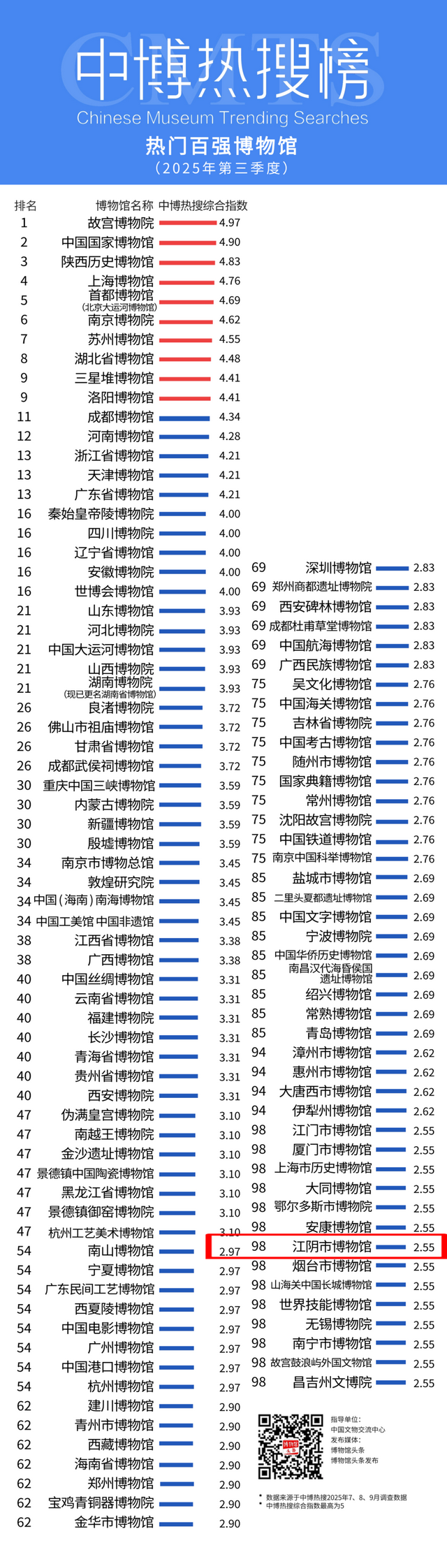 由中国文物交流中心指导、博物馆头条统计的「中博热搜榜」发布2025年第三季度全国热门百强推介榜单及延伸子榜单。江阴市博物馆荣登“全国热门博物馆百强”榜单第98名、“百强热门博物馆区县馆前50”榜单第5名!