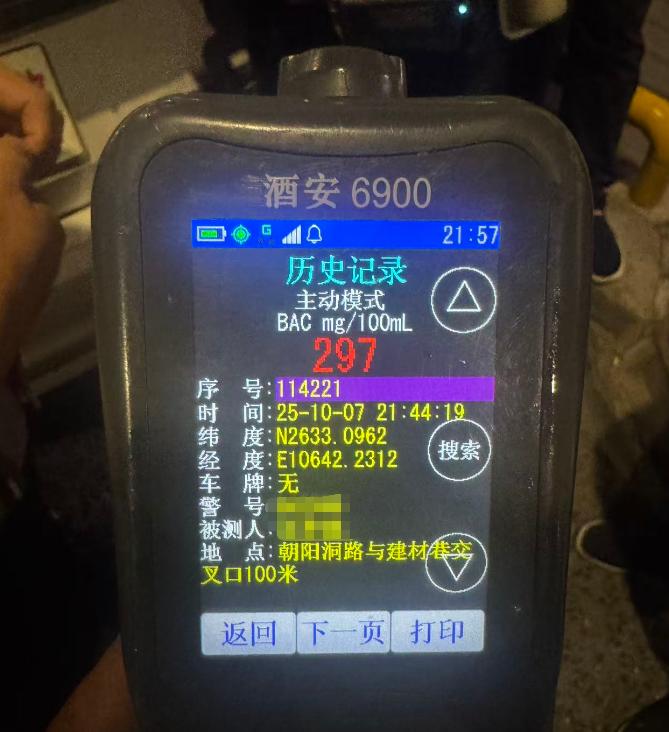 10月7日晚,正值中秋国庆假期,南明交警五中队民警在辖区朝阳洞路开展重点交通交通违法整治工作,保障群众出行安全。当晚21时许,一名男子驾驶摩托车未佩戴安全头盔,且该摩托车未正确悬挂机动车号牌,于是民警示意该车驾驶人靠边停车接受检查。经现场对吴某某进行呼气式酒精检测,检测结果为297mg/100mL,吴某某涉嫌醉酒后驾驶机动车,民警请其读出检测数值时,他感到十分惊讶,并称“我只喝了一瓶啤酒!”。随后民警将其带至医院提取血样。