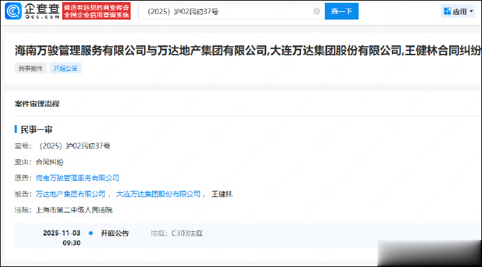 近日,法院公开海南万骏管理服务有限公司起诉大连万达集团股份有限公司、万达地产集团有限公司、王健林合同纠纷案件开庭信息。公告显示,该案件计划将于11月3日在上海市第二中级人民法院开庭审理。