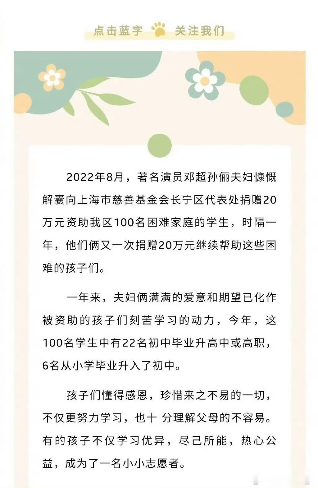 邓超孙俪为助学捐赠累计上千万 邓超孙俪捐资助学13年,爱与善从未停![心][爱