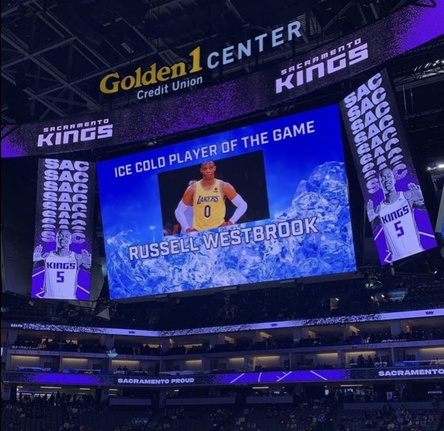 美媒NBAMemes晒出国王主场旧照,并配文称“国王这次让威斯布鲁克吃尽苦头”。画面显示大屏写有“本场最冷球员:拉塞尔-威斯布鲁克”,并使用其身穿湖人球衣的赛场照。